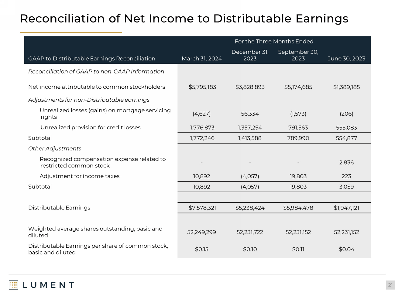 Reconciliation of Net Income to Distributable Earnings 21 For the Three Months Ended GAAP to Distributable Earnings Reconciliation March 31, 2024 December 31, 2023 September 30, 2023 June 30, 2023 Reconciliation of GAAP to non - GAAP Information Net income attributable to common stockholders $5,795,183 $3,828,893 $5,174,685 $1,389,185 Adjustments for non - Distributable earnings Unrealized losses (gains) on mortgage servicing rights (4,627) 56,334 (1,573) (206) Unrealized provision for credit losses 1,776,873 1,357,254 791,563 555,083 Subtotal 1,772,246 1,413,588 789,990 554,877 Other Adjustments Recognized compensation expense related to restricted common stock - - - 2,836 Adjustment for income taxes 10,892 (4,057) 19,803 223 Subtotal 10,892 (4,057) 19,803 3,059 Distributable Earnings $7,578,321 $5,238,424 $5,984,478 $1,947,121 Weighted average shares outstanding, b asic and diluted 52,249,299 52,231,722 52,231,152 52,231,152 Distributable Earnings per share of common stock , b asic and diluted $0.15 $0.10 $0.11 $0.04