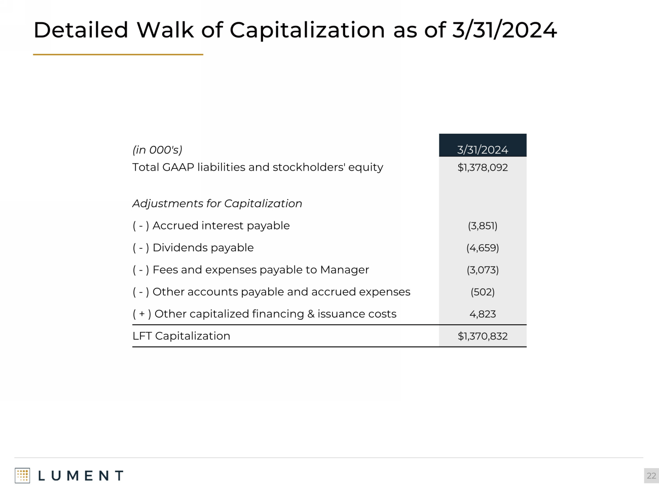 Detailed Walk of Capitalization as of 3/31/2024 22 (in 000's) 3/31/2024 Total GAAP liabilities and stockholders' equity $1,378,092 Adjustments for Capitalization ( - ) Accrued interest payable (3,851) ( - ) Dividends payable (4,659) ( - ) Fees and expenses payable to Manager (3,073) ( - ) Other accounts payable and accrued expenses (502) ( + ) Other capitalized financing & issuance costs 4,823 LFT Capitalization $1,370,832