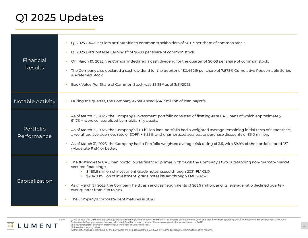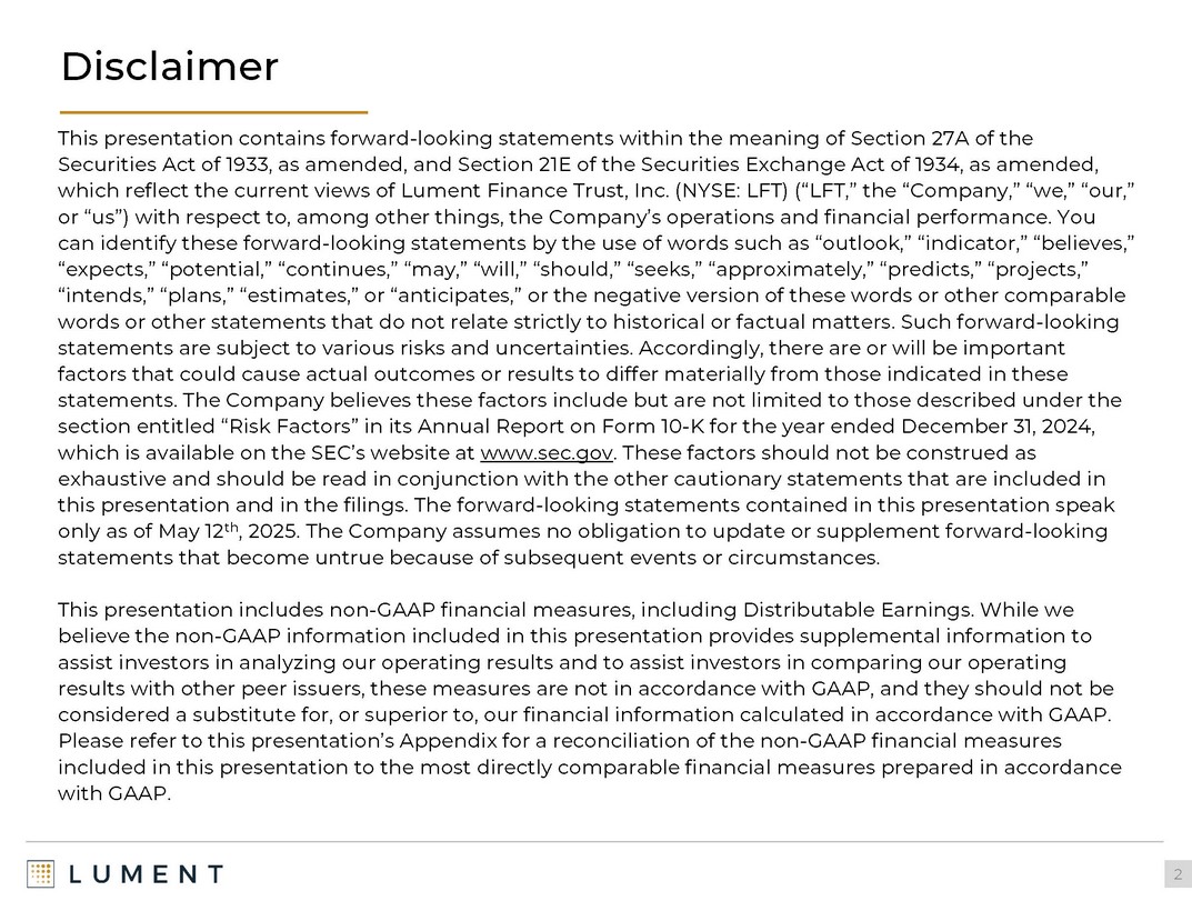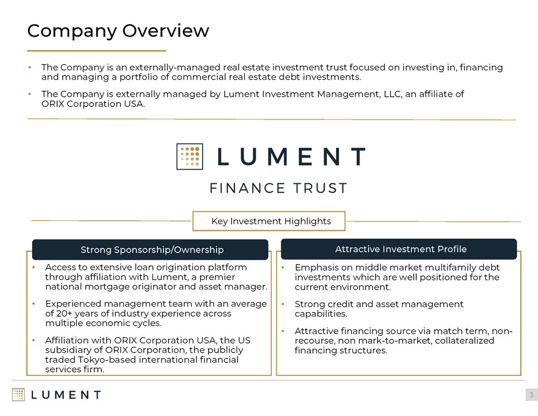Disclaimer 2 This presentation contains forward - looking statements within the meaning of Section 27A of the Securities Act of 1933, as amended, and Section 21E of the Securities Exchange Act of 1934, as amended, which reflect the current views of Lument Finance Trust, Inc. (NYSE: LFT) (“LFT,” the “Company,” “we,” “our,” or “us”) with respect to, among other things, the Company’s operations and financial performance. You can identify these forward - looking statements by the use of words such as “outlook,” “indicator,” “believes,” “expects,” “potential,” “continues,” “may,” “will,” “should,” “seeks,” “approximately,” “predicts,” “projects,” “intends,” “plans,” “estimates,” or “anticipates,” or the negative version of these words or other comparable words or other statements that do not relate strictly to historical or factual matters. Such forward - looking statements are subject to various risks and uncertainties. Accordingly, there are or will be important factors that could cause actual outcomes or results to differ materially from those indicated in these statements. The Company believes these factors include but are not limited to those described under the section entitled “Risk Factors” in its Annual Report on Form 10 - K for the year ended December 31, 2024, which is available on the SEC’s website at www.sec.gov . These factors should not be construed as exhaustive and should be read in conjunction with the other cautionary statements that are included in this presentation and in the filings. The forward - looking statements contained in this presentation speak only as of May 12 th , 2025. The Company assumes no obligation to update or supplement forward-looking statements that become untrue because of subsequent events or circumstances. This presentation includes non - GAAP financial measures, including Distributable Earnings. While we believe the non - GAAP information included in this presentation provides supplemental information to assist investors in analyzing our operating results and to assist investors in comparing our operating results with other peer issuers, these measures are not in accordance with GAAP, and they should not be considered a substitute for, or superior to, our financial information calculated in accordance with GAAP. Please refer to this presentation’s Appendix for a reconciliation of the non - GAAP financial measures included in this presentation to the most directly comparable financial measures prepared in accordance with GAAP.