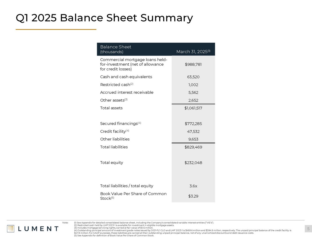 Q1 2025 Updates 4 Note: (1) We believe that Distributable Earnings provides meaningful information to consider in addition to our net income (los s) and cash flows from operating activities determined in accordance with GAAP. Distributable Earnings mirrors how we calculated Core Earnings in the past. Please see Appendix for reconciliation to GAAP. (2) See Appendix for definition of Book Value Per Share of Common Stock. (3) Based on carrying value. (4) If all extensions are exercised by the borrowers, the CRE loan portfolio will have a weighted average remaining term of 2 4 months. • Q1 2025 GAAP net loss attributable to common stockholders of $0.03 per share of common stock. • Q1 2025 Distributable Earnings (1) of $0.08 per share of common stock. • On March 19, 2025, the Company declared a cash dividend for the quarter of $0.08 per share of common stock. • The Company also declared a cash dividend for the quarter of $0.49219 per share of 7.875% Cumulative Redeemable Series A Preferred Stock. • Book Value Per Share of Common Stock was $3.29 (2) as of 3/31/2025. Financial Results • During the quarter, the Company experienced $54.7 million of loan payoffs. Notable Activity • As of March 31, 2025, the Company’s investment portfolio consisted of floating - rate CRE loans of which approximately 91.7% (3) were collateralized by multifamily assets. • As of March 31, 2025, the Company’s $1.0 billion loan portfolio had a weighted average remaining initial term of 5 months (4) , a weighted average note rate of SOFR + 3.55%, and unamortized aggregate purchase discounts of $3.0 million. • As of March 31, 2025, the Company had a Portfolio weighted average risk rating of 3.5, with 59.9% of the portfolio rated “3” (Moderate Risk) or better. Portfolio Performance • The floating - rate CRE loan portfolio was financed primarily through the Company’s two outstanding non - mark - to - market secured financings: • $489.6 million of investment grade notes issued through 2021 - FL1 CLO. • $284.8 million of investment grade notes issued through LMF 2023 - 1. • As of March 31, 2025, the Company held cash and cash equivalents of $63.5 million, and its leverage ratio declined quarter - over - quarter from 3.7x to 3.6x. • The Company’s corporate debt matures in 2026. Capitalization