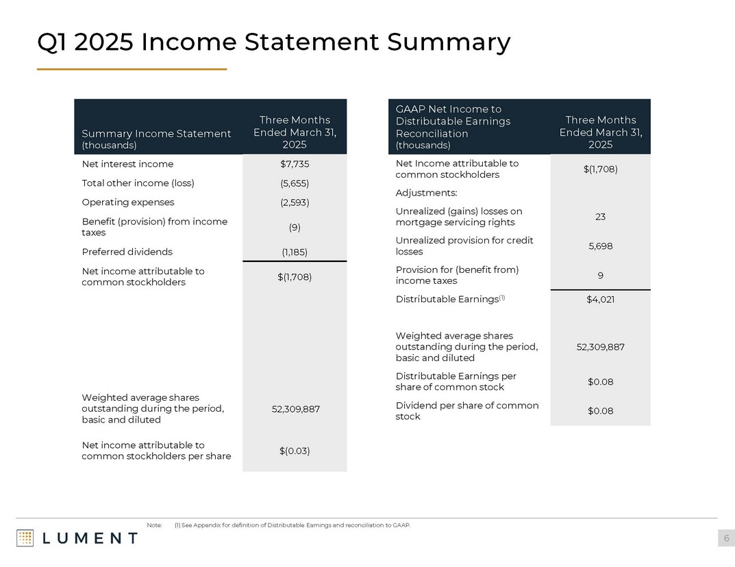 Q1 2025 Balance Sheet Summary 5 March 31, 2025 (1) Balance Sheet (thousands) $988,781 Commercial mortgage loans held - for - investment (net of allowance for credit losses) 63,520 Cash and cash equivalents 1,002 Restricted cash (2) 5,562 Accrued interest receivable 2,652 Other assets (3) $1,061,517 Total assets $772,285 Secured financings (4) 47,532 Credit facility (4) 9,653 Other liabilities $829,469 Total liabilities $232,048 Total equity 3.6x Total liabilities / total equity $3.29 Book Value Per Share of Common Stock (5) Note: (1) See Appendix for detailed consolidated balance sheet, including the Company’s consolidated variable interest entities (“VIE’s”). (2) Restricted cash held by LMF 2023 - 1 is available for investment in eligible mortgage assets. (3) Includes mortgage servicing rights, carried at fair value of $0.6 million. (4) Outstanding principal amount of investment grade notes issued by 2021 - FL1 CLO and LMF 2023 - 1 is $489.6 million and $284.8 m illion, respectively. The unpaid principal balance of the credit facility is $47.8 million. For GAAP purposes, these liabilities are carried at their outstanding unpaid principal balance, net of any una mor tized discounts and debt issuance costs. (5) See Appendix for definition of Book Value Per Share of Common Stock.