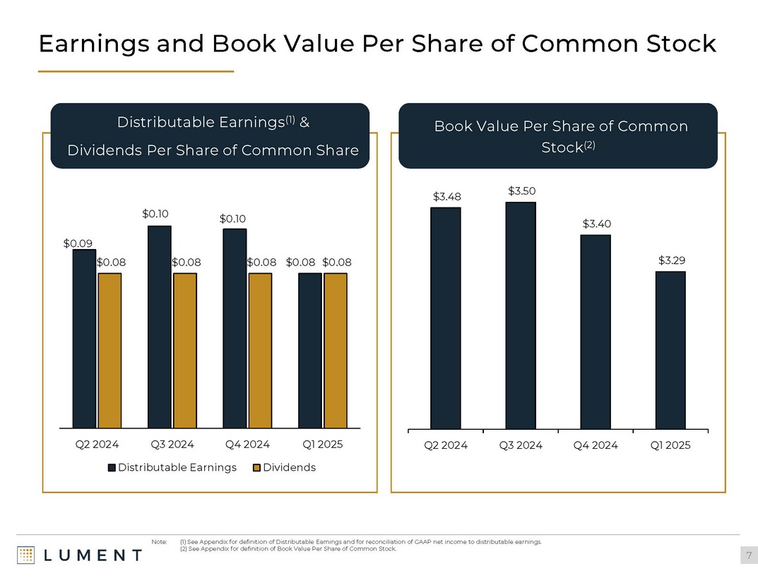 Q1 2025 Income Statement Summary 6 Three Months Ended March 31, 2025 Summary Income Statement (thousands) $7,735 Net interest income (5,655) Total other income (loss) (2,593) Operating expenses (9) Benefit (provision) from income taxes (1,185) Preferred dividends $(1,708) Net income attributable to common stockholders 52,309,887 Weighted average shares outstanding during the period, basic and diluted $(0.03) Net income attributable to common stockholders per share Three Months Ended March 31, 2025 GAAP Net Income to Distributable Earnings Reconciliation (thousands) $(1,708) Net Income attributable to common stockholders Adjustments: 23 Unrealized (gains) losses on mortgage servicing rights 5,698 Unrealized provision for credit losses 9 Provision for (benefit from) income taxes $4,021 Distributable Earnings (1) 52,309,887 Weighted average shares outstanding during the period, basic and diluted $0.08 Distributable Earnings per share of common stock $0.08 Dividend per share of common stock Note: (1) See Appendix for definition of Distributable Earnings and reconciliation to GAAP.