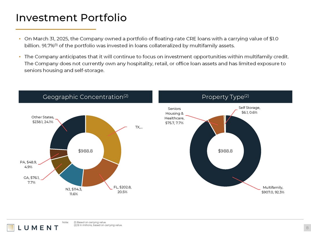 Earnings and Book Value Per Share of Common Stock 7 $0.09 $0.10 $0.10 $0.08 $0.08 $0.08 $0.08 $0.08 Q2 2024 Q3 2024 Q4 2024 Q1 2025 Distributable Earnings Dividends $3.48 $3.50 $3.40 $3.29 Q2 2024 Q3 2024 Q4 2024 Q1 2025 Distributable Earnings (1) & Dividends Per Share of Common Share Book Value Per Share of Common Stock (2) Note: (1) See Appendix for definition of Distributable Earnings and for reconciliation of GAAP net income to distributable ear nings. (2) See Appendix for definition of Book Value Per Share of Common Stock.