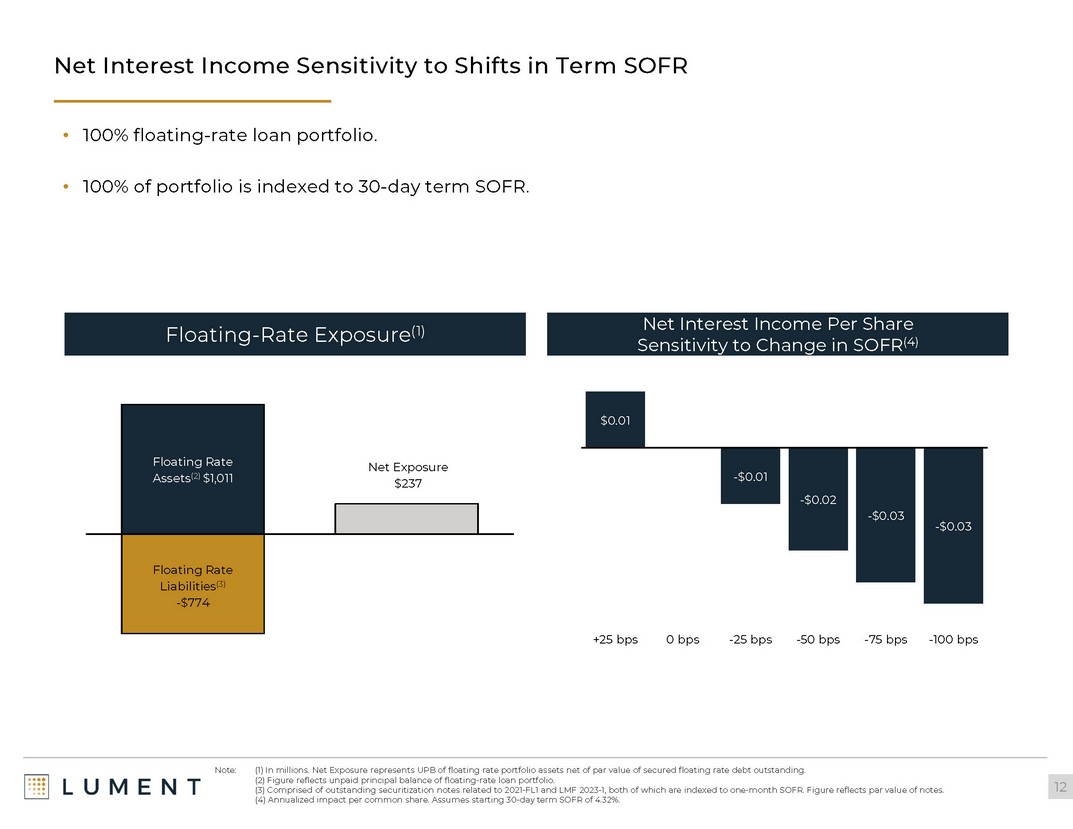 $0.01 - $0.01 - $0.02 - $0.03 - $0.03 +25 bps 0 bps -25 bps -50 bps -75 bps -100 bps Net Interest Income Sensitivity to Shifts in Term SOFR 12 Floating Rate Assets (2) $1,011 Floating Rate Liabilities (3) - $774 Net Exposure $237 Floating - Rate Exposure (1) Net Interest Income Per Share Sensitivity to Change in SOFR (4) Note: (1) In millions. Net Exposure represents UPB of floating rate portfolio assets net of par value of secured floating rate debt outstanding. (2) Figure reflects unpaid principal balance of floating - rate loan portfolio. (3) Comprised of outstanding securitization notes related to 2021 - FL1 and LMF 2023 - 1, both of which are indexed to one - month SO FR. Figure reflects par value of notes. (4) Annualized impact per common share. Assumes starting 30 - day term SOFR of 4.32%. • 100% floating - rate loan portfolio. • 100% of portfolio is indexed to 30 - day term SOFR.