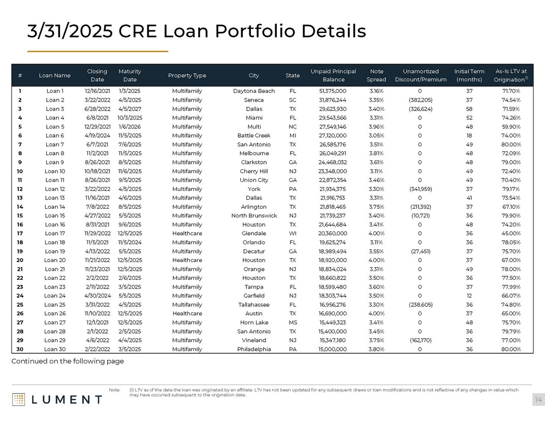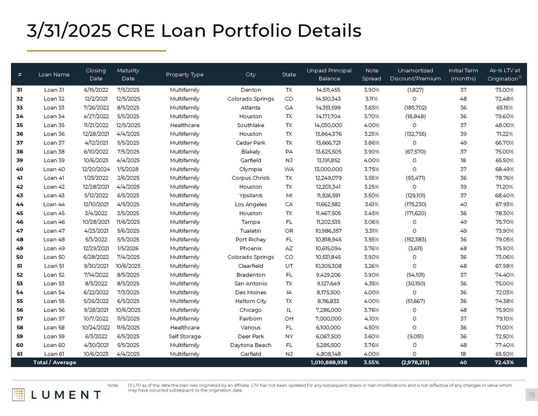 3/31/2025 CRE Loan Portfolio Details 14 Continued on the following page Note: (1) LTV as of the date the loan was originated by an affiliate. LTV has not been updated for any subsequent draws or loan modifications and is not reflective of any changes in value which may have occurred subsequent to the origination date. # Loan Name Closing Date Maturity Date Property Type City State Unpaid Principal Balance Note Spread Unamortized Discount/Premium Initial Term (months) As-Is LTV at Origination (1) 1 Loan 1 12/16/2021 1/3/2025 Multifamily Daytona Beach FL 51,375,000 3.16% 0 37 71.70% 2 Loan 2 3/22/2022 4/5/2025 Multifamily Seneca SC 31,876,244 3.35% (382,205) 37 74.54% 3 Loan 3 6/28/2022 4/5/2027 Multifamily Dallas TX 29,623,930 3.40% (326,624) 58 71.59% 4 Loan 4 6/8/2021 10/3/2025 Multifamily Miami FL 29,543,566 3.31% 0 52 74.26% 5 Loan 5 12/29/2021 1/6/2026 Multifamily Multi NC 27,549,146 3.96% 0 48 59.90% 6 Loan 6 4/19/2024 11/5/2025 Multifamily Battle Creek MI 27,120,000 3.05% 0 18 74.00% 7 Loan 7 6/7/2021 7/6/2025 Multifamily San Antonio TX 26,585,176 3.51% 0 49 80.00% 8 Loan 8 11/2/2021 11/5/2025 Multifamily Melbourne FL 26,049,291 3.81% 0 48 72.09% 9 Loan 9 8/26/2021 8/5/2025 Multifamily Clarkston GA 24,468,032 3.61% 0 48 79.00% 10 Loan 10 10/18/2021 11/6/2025 Multifamily Cherry Hill NJ 23,348,000 3.11% 0 49 72.40% 11 Loan 11 8/26/2021 9/5/2025 Multifamily Union City GA 22,872,354 3.46% 0 49 70.40% 12 Loan 12 3/22/2022 4/5/2025 Multifamily York PA 21,934,375 3.30% (341,959) 37 79.17% 13 Loan 13 11/16/2021 4/6/2025 Multifamily Dallas TX 21,916,753 3.31% 0 41 73.54% 14 Loan 14 7/8/2022 8/5/2025 Multifamily Arlington TX 21,818,465 3.75% (211,392) 37 67.10% 15 Loan 15 4/27/2022 5/5/2025 Multifamily North Brunswick NJ 21,739,237 3.40% (10,721) 36 79.90% 16 Loan 16 8/31/2021 9/6/2025 Multifamily Houston TX 21,644,684 3.41% 0 48 74.20% 17 Loan 17 11/29/2022 12/5/2025 Healthcare Glendale WI 20,360,000 4.00% 0 36 45.00% 18 Loan 18 11/5/2021 11/5/2024 Multifamily Orlando FL 19,625,274 3.11% 0 36 78.05% 19 Loan 19 4/13/2022 5/5/2025 Multifamily Decatur GA 18,989,494 3.55% (27,451) 37 75.70% 20 Loan 20 11/21/2022 12/5/2025 Healthcare Houston TX 18,920,000 4.00% 0 37 67.00% 21 Loan 21 11/23/2021 12/5/2025 Multifamily Orange NJ 18,834,024 3.31% 0 49 78.00% 22 Loan 22 2/2/2022 2/6/2025 Multifamily Houston TX 18,660,822 3.50% 0 36 77.50% 23 Loan 23 2/11/2022 3/5/2025 Multifamily Tampa FL 18,599,480 3.60% 0 37 77.99% 24 Loan 24 4/30/2024 5/5/2025 Multifamily Garfield NJ 18,303,744 3.50% 0 12 66.07% 25 Loan 25 3/31/2022 4/5/2025 Multifamily Tallahassee FL 16,956,276 3.30% (238,605) 36 74.80% 26 Loan 26 11/10/2022 12/5/2025 Healthcare Austin TX 16,690,000 4.00% 0 37 65.00% 27 Loan 27 12/1/2021 12/5/2025 Multifamily Horn Lake MS 15,449,323 3.41% 0 48 75.70% 28 Loan 28 2/1/2022 2/5/2025 Multifamily San Antonio TX 15,400,000 3.45% 0 36 79.79% 29 Loan 29 4/6/2022 4/4/2025 Multifamily Vineland NJ 15,347,180 3.75% (162,170) 36 77.00% 30 Loan 30 2/22/2022 3/5/2025 Multifamily Philadelphia PA 15,000,000 3.80% 0 36 80.00%