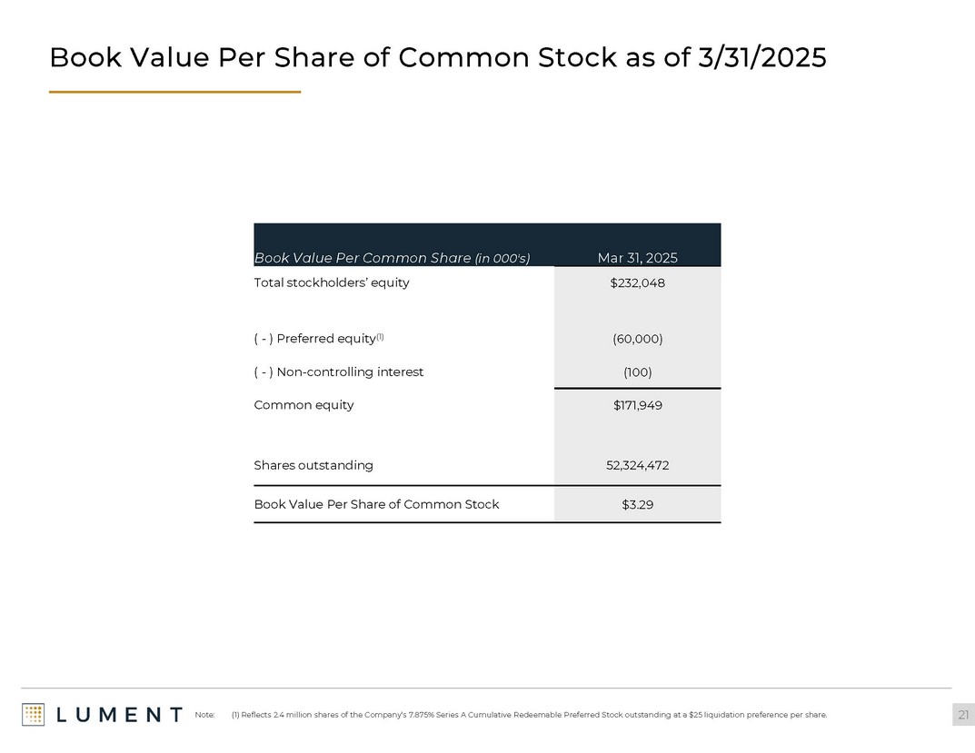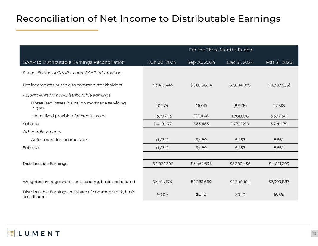 Reconciliation of Net Income to Distributable Earnings 19 For the Three Months Ended Mar 31, 2025 Dec 31, 2024 Sep 30, 2024 Jun 30, 2024 GAAP to Distributable Earnings Reconciliation Reconciliation of GAAP to non - GAAP Information $(1,707,526) $3,604,879 $5,095,684 $3,413,445 Net income attributable to common stockholders Adjustments for non - Distributable earnings 22,518 (8,978) 46,017 10,274 Unrealized losses (gains) on mortgage servicing rights 5,697,661 1,781,098 317,448 1,399,703 Unrealized provision for credit losses 5,720,179 1,772,1210 363,465 1,409,977 Subtotal Other Adjustments 8,550 5,457 3,489 (1,030) Adjustment for income taxes 8,550 5,457 3,489 (1,030) Subtotal $4,021,203 $5,382,456 $5,462,638 $4,822,392 Distributable Earnings 52,309,887 52,300,100 52,283,669 52,266,174 Weighted average shares outstanding, b asic and diluted $0.08 $0.10 $0.10 $0.09 Distributable Earnings per share of common stock , b asic and diluted