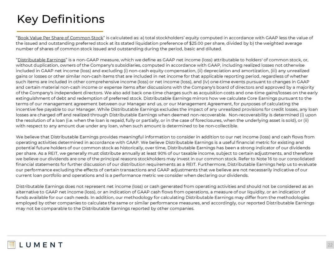 Key Definitions 22 “ Book Value Per Share of Common Stock ” is calculated as: a) total stockholders’ equity computed in accordance with GAAP less the value of the issued and outstanding preferred stock at its stated liquidation preference of $25.00 per share, divided by b) the weight ed average number of shares of common stock issued and outstanding during the period, basic and diluted. “ Distributable Earnings ” is a non - GAAP measure, which we define as GAAP net income (loss) attributable to holders' of common stock, or, without duplication, owners of the Company's subsidiaries, computed in accordance with GAAP, including realized losses not ot her wise included in GAAP net income (loss) and excluding (i) non - cash equity compensation, (ii) depreciation and amortization, (iii) any unrealized gains or losses or other similar non - cash items that are included in net income for that applicable reporting period, regardless of whether such items are included in other comprehensive income (loss) or net income (loss), and (iv) one - time events pursuant to changes in GAAP and certain material non - cash income or expense items after discussions with the Company's board of directors and approved by a majority of the Company's independent directors. We also add back one - time charges such as acquisition costs and one - time gains/losses on the early extinguishment of debt and redemption of preferred stock. Distributable Earnings mirrors how we calculate Core Earnings pursu ant to the terms of our management agreement between our Manager and us, or our Management Agreement, for purposes of calculating the incentive fee payable to our Manager. While Distributable Earnings excludes the impact of any unrealized provisions for credi t l osses, any loan losses are charged off and realized through Distributable Earnings when deemed non - recoverable. Non - recoverability is determine d (i) upon the resolution of a loan (i.e. when the loan is repaid, fully or partially, or in the case of foreclosures, when the underlyi ng asset is sold), or (ii) with respect to any amount due under any loan, when such amount is determined to be non - collectible. We believe that Distributable Earnings provides meaningful information to consider in addition to our net income (loss) and c ash flows from operating activities determined in accordance with GAAP. We believe Distributable Earnings is a useful financial metric for e xis ting and potential future holders of our common stock as historically, over time, Distributable Earnings has been a strong indicator o f o ur dividends per share. As a REIT, we generally must distribute annually at least 90% of our taxable income, subject to certain adjustment s, and therefore we believe our dividends are one of the principal reasons stockholders may invest in our common stock. Refer to Note 16 to ou r c onsolidated financial statements for further discussion of our distribution requirements as a REIT. Furthermore, Distributable Earnings h elp us to evaluate our performance excluding the effects of certain transactions and GAAP adjustments that we believe are not necessarily indica tiv e of our current loan portfolio and operations and is a performance metric we consider when declaring our dividends. Distributable Earnings does not represent net income (loss) or cash generated from operating activities and should not be con sid ered as an alternative to GAAP net income (loss), or an indication of GAAP cash flows from operations, a measure of our liquidity, or an in dication of funds available for our cash needs. In addition, our methodology for calculating Distributable Earnings may differ from the m eth odologies employed by other companies to calculate the same or similar performance measures, and accordingly, our reported Distributabl e E arnings may not be comparable to the Distributable Earnings reported by other companies.