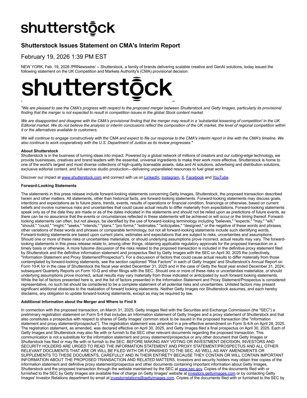 Shutterstock Issues Statement on CMA's Interim Report February 19, 2026 1:39 PM EST NEW YORK, Feb. 19, 2026 /PRNewswire/ -- Shutterstock, a family of brands delivering scalable creative and GenAI solutions, today issued the following statement on the UK Competition and Markets Authority's (CMA) provisional decision: "We are pleased to see the CMA's progress with respect to the proposed merger between Shutterstock and Getty Images, particularly its provisional finding that the merger is not expected to result in competition issues in the global Stock content market. We are disappointed and disagree with the CMA's provisional finding that the merger may result in a 'substantial lessening of competition' in the UK Editorial market. We do not believe the analysis or interim conclusions reflect the composition of the UK market, the level of regional competition within it or the alternatives available to customers. We will continue to engage constructively with the CMA and expect to file our response to the CMA's interim report in line with the CMA's timeline. We also continue to work cooperatively with the U.S. Department of Justice as its review progresses." About Shutterstock Shutterstock is in the business of turning ideas into impact. Powered by a global network of millions of creators and our cutting-edge technology, we provide businesses, creatives and brand leaders with the essential, universal ingredients to make their work more effective. Shutterstock is home to one of the world's largest and most diverse collections of high-quality licensable assets, data and AI solutions, advertising and distribution solutions, exclusive editorial content, and full-service studio production—delivering unparalleled resources to fuel great work. Discover our impact at www.shutterstock.com and connect with us on LinkedIn, Instagram, X, Facebook and YouTube. Forward-Looking Statements The statements in this press release include forward-looking statements concerning Getty Images, Shutterstock, the proposed transaction described herein and other matters. All statements, other than historical facts, are forward-looking statements. Forward-looking statements may discuss goals, intentions and expectations as to future plans, trends, events, results of operations or financial condition, financings or otherwise, based on current beliefs and involve numerous risks and uncertainties that could cause actual results to differ materially from expectations. Forward-looking statements speak only as of the date they are made or as of the dates indicated in the statements and should not be relied upon as predictions of future events, as there can be no assurance that the events or circumstances reflected in these statements will be achieved or will occur or the timing thereof. Forward- looking statements can often, but not always, be identified by the use of forward-looking terminology including "believes," "expects," "may," "will," "should," "could," "might," "seeks," "intends," "plans," "pro forma," "estimates," "anticipates," "designed," or the negative of these words and phrases, other variations of these words and phrases or comparable terminology, but not all forward-looking statements include such identifying words. Forward-looking statements are based upon current plans, estimates and expectations that are subject to risks, uncertainties and assumptions. Should one or more of these risks or uncertainties materialize, or should underlying assumptions prove incorrect, actual results may vary. The forward- looking statements in this press release relate to, among other things, obtaining applicable regulatory approvals for the proposed transaction on a timely basis or otherwise. A more fulsome discussion of the risks related to the proposed transaction is included in the definitive proxy statement filed by Shutterstock and the definitive information statement and prospectus filed by Getty Images with the SEC on April 30, 2025 the (collectively, "Information Statement and Proxy Statement/Prospectus"). For a discussion of factors that could cause actual results to differ materially from those contemplated by forward-looking statements, see the section captioned "Risk Factors" in each of Getty Images' and Shutterstock's Annual Report on Form 10-K for in the case of Shutterstock the fiscal year ended December 31, 2025 and in the case of Getty the fiscal year ended December 31, 2024, subsequent Quarterly Reports on Form 10-Q and other filings with the SEC. Should one or more of these risks or uncertainties materialize, or should underlying assumptions prove incorrect, actual results may vary materially from those indicated or anticipated by such forward looking statements. While the list of factors presented here is, and the list of factors presented in the Information Statement and Proxy Statement/Prospectus is considered representative, no such list should be considered to be a complete statement of all potential risks and uncertainties. Unlisted factors may present significant additional obstacles to the realization of forward looking statements. Neither Getty Images nor Shutterstock assumes, and each hereby disclaims, any obligation to update forward-looking statements, except as may be required by law. Additional Information about the Merger and Where to Find It In connection with the proposed transaction, on March 31, 2025, Getty Images filed with the Securities and Exchange Commission (the "SEC") a preliminary registration statement on Form S-4 that includes an information statement of Getty Images and a proxy statement of Shutterstock and that also constitutes a prospectus with respect to shares of Getty Images' common stock to be issued in the proposed transaction (the "information statement and proxy statement/prospectus"). The registration statement was amended in a pre-effective amendment on Form S-4/A on April 28, 2025. The registration statement, as amended, was declared effective on April 30, 2025, an