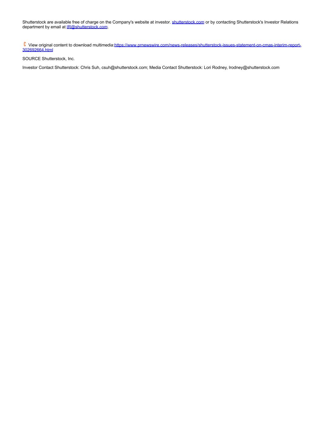 Shutterstock are available free of charge on the Company's website at investor. shutterstock.com or by contacting Shutterstock's Investor Relations department by email at IR@shutterstock.com. View original content to download multimedia:https://www.prnewswire.com/news-releases/shutterstock-issues-statement-on-cmas-interim-report- 302692664.html SOURCE Shutterstock, Inc. Investor Contact Shutterstock: Chris Suh, csuh@shutterstock.com; Media Contact Shutterstock: Lori Rodney, lrodney@shutterstock.com