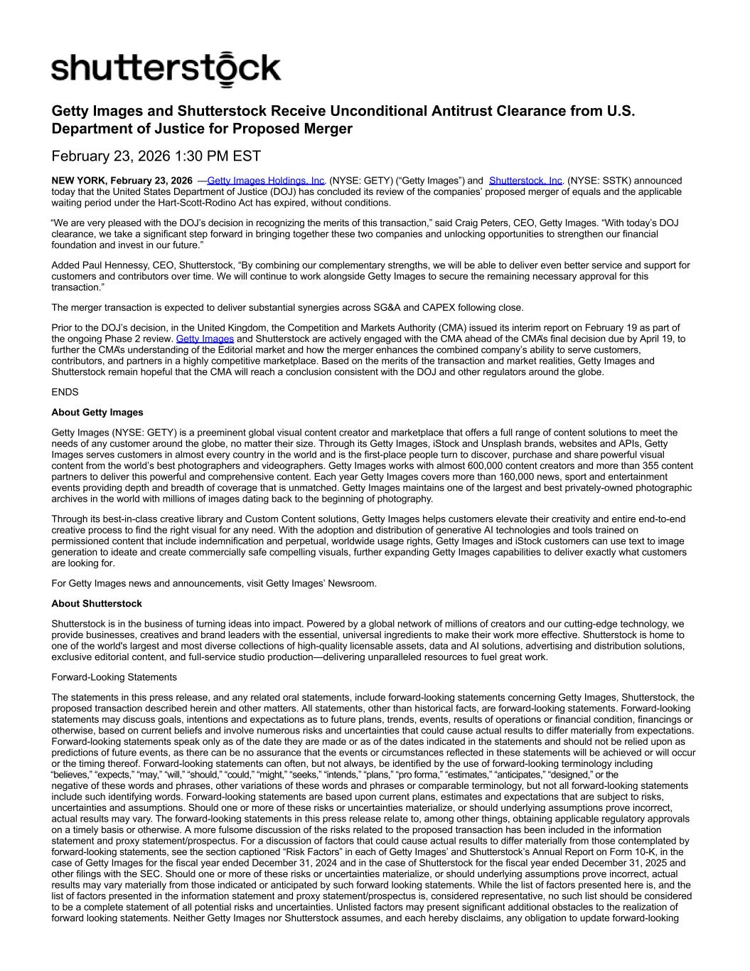 Getty Images and Shutterstock Receive Unconditional Antitrust Clearance from U.S. Department of Justice for Proposed Merger February 23, 2026 1:30 PM EST NEW YORK, February 23, 2026 — Getty Images Holdings, Inc. (NYSE: GETY) (“Getty Images”) and Shutterstock, Inc. (NYSE: SSTK) announced today that the United States Department of Justice (DOJ) has concluded its review of the companies’ proposed merger of equals and the applicable waiting period under the Hart-Scott-Rodino Act has expired, without conditions. “We are very pleased with the DOJ’s decision in recognizing the merits of this transaction,” said Craig Peters, CEO, Getty Images. “With today’s DOJ clearance, we take a significant step forward in bringing together these two companies and unlocking opportunities to strengthen our financial foundation and invest in our future.” Added Paul Hennessy, CEO, Shutterstock, “By combining our complementary strengths, we will be able to deliver even better service and support for customers and contributors over time. We will continue to work alongside Getty Images to secure the remaining necessary approval for this transaction.” The merger transaction is expected to deliver substantial synergies across SG&A and CAPEX following close. Prior to the DOJ’s decision, in the United Kingdom, the Competition and Markets Authority (CMA) issued its interim report on February 19 as part of the ongoing Phase 2 review. Getty Images and Shutterstock are actively engaged with the CMA ahead of the CMA’s final decision due by April 19, to further the CMA’s understanding of the Editorial market and how the merger enhances the combined company’s ability to serve customers, contributors, and partners in a highly competitive marketplace. Based on the merits of the transaction and market realities, Getty Images and Shutterstock remain hopeful that the CMA will reach a conclusion consistent with the DOJ and other regulators around the globe. ENDS About Getty Images Getty Images (NYSE: GETY) is a preeminent global visual content creator and marketplace that offers a full range of content solutions to meet the needs of any customer around the globe, no matter their size. Through its Getty Images, iStock and Unsplash brands, websites and APIs, Getty Images serves customers in almost every country in the world and is the first-place people turn to discover, purchase and share powerful visual content from the world’s best photographers and videographers. Getty Images works with almost 600,000 content creators and more than 355 content partners to deliver this powerful and comprehensive content. Each year Getty Images covers more than 160,000 news, sport and entertainment events providing depth and breadth of coverage that is unmatched. Getty Images maintains one of the largest and best privately-owned photographic archives in the world with millions of images dating back to the beginning of photography. Through its best-in-class creative library and Custom Content solutions, Getty Images helps customers elevate their creativity and entire end-to-end creative process to find the right visual for any need. With the adoption and distribution of generative AI technologies and tools trained on permissioned content that include indemnification and perpetual, worldwide usage rights, Getty Images and iStock customers can use text to image generation to ideate and create commercially safe compelling visuals, further expanding Getty Images capabilities to deliver exactly what customers are looking for. For Getty Images news and announcements, visit Getty Images’ Newsroom. About Shutterstock Shutterstock is in the business of turning ideas into impact. Powered by a global network of millions of creators and our cutting-edge technology, we provide businesses, creatives and brand leaders with the essential, universal ingredients to make their work more effective. Shutterstock is home to one of the world's largest and most diverse collections of high-quality licensable assets, data and AI solutions, advertising and distribution solutions, exclusive editorial content, and full-service studio production—delivering unparalleled resources to fuel great work. Forward-Looking Statements The statements in this press release, and any related oral statements, include forward-looking statements concerning Getty Images, Shutterstock, the proposed transaction described herein and other matters. All statements, other than historical facts, are forward-looking statements. Forward-looking statements may discuss goals, intentions and expectations as to future plans, trends, events, results of operations or financial condition, financings or otherwise, based on current beliefs and involve numerous risks and uncertainties that could cause actual results to differ materially from expectations. Forward-looking statements speak only as of the date they are made or as of the dates indicated in the statements and should not be relied upon as predictions of future events, as there can be no assurance that the events or circumstances reflected in these statements will be achieved or will occur or the timing thereof. Forward-looking statements can often, but not always, be identified by the use of forward-looking terminology including “believes,” “expects,” “may,” “will,” “should,” “could,” “might,” “seeks,” “intends,” “plans,” “pro forma,” “estimates,” “anticipates,” “designed,” or the negative of these words and phrases, other variations of these words and phrases or comparable terminology, but not all forward-looking statements include such identifying words. Forward-looking statements are based upon current plans, estimates and expectations that are subject to risks, uncertainties and assumptions. Should one or more of these risks or uncertainties materialize, or should underlying assumptions prove incorrect, actual results may vary. The forward-looking statemen