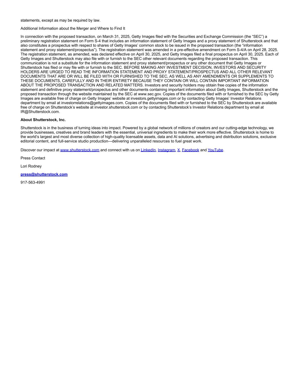 statements, except as may be required by law. Additional Information about the Merger and Where to Find It In connection with the proposed transaction, on March 31, 2025, Getty Images filed with the Securities and Exchange Commission (the “SEC”) a preliminary registration statement on Form S-4 that includes an information statement of Getty Images and a proxy statement of Shutterstock and that also constitutes a prospectus with respect to shares of Getty Images’ common stock to be issued in the proposed transaction (the “information statement and proxy statement/prospectus”). The registration statement was amended in a pre-effective amendment on Form S-4/A on April 28, 2025. The registration statement, as amended, was declared effective on April 30, 2025, and Getty Images filed a final prospectus on April 30, 2025. Each of Getty Images and Shutterstock may also file with or furnish to the SEC other relevant documents regarding the proposed transaction. This communication is not a substitute for the information statement and proxy statement/prospectus or any other document that Getty Images or Shutterstock has filed or may file with or furnish to the SEC. BEFORE MAKING ANY INVESTMENT DECISION, INVESTORS AND SECURITY HOLDERS ARE URGED TO READ THE INFORMATION STATEMENT AND PROXY STATEMENT/PROSPECTUS AND ALL OTHER RELEVANT DOCUMENTS THAT ARE OR WILL BE FILED WITH OR FURNISHED TO THE SEC, AS WELL AS ANY AMENDMENTS OR SUPPLEMENTS TO THESE DOCUMENTS, CAREFULLY AND IN THEIR ENTIRETY BECAUSE THEY CONTAIN OR WILL CONTAIN IMPORTANT INFORMATION ABOUT THE PROPOSED TRANSACTION AND RELATED MATTERS. Investors and security holders may obtain free copies of the information statement and definitive proxy statement/prospectus and other documents containing important information about Getty Images, Shutterstock and the proposed transaction through the website maintained by the SEC at www.sec.gov. Copies of the documents filed with or furnished to the SEC by Getty Images are available free of charge on Getty Images’ website at investors.gettyimages.com or by contacting Getty Images’ Investor Relations department by email at investorrelations@gettyimages.com. Copies of the documents filed with or furnished to the SEC by Shutterstock are available free of charge on Shutterstock’s website at investor.shutterstock.com or by contacting Shutterstock’s Investor Relations department by email at IR@Shutterstock.com. About Shutterstock, Inc. Shutterstock is in the business of turning ideas into impact. Powered by a global network of millions of creators and our cutting-edge technology, we provide businesses, creatives and brand leaders with the essential, universal ingredients to make their work more effective. Shutterstock is home to the world’s largest and most diverse collection of high-quality licensable assets, data and AI solutions, advertising and distribution solutions, exclusive editorial content, and full-service studio production—delivering unparalleled resources to fuel great work. Discover our impact at www.shutterstock.com and connect with us on LinkedIn, Instagram, X, Facebook and YouTube. Press Contact Lori Rodney press@shutterstock.com 917-563-4991