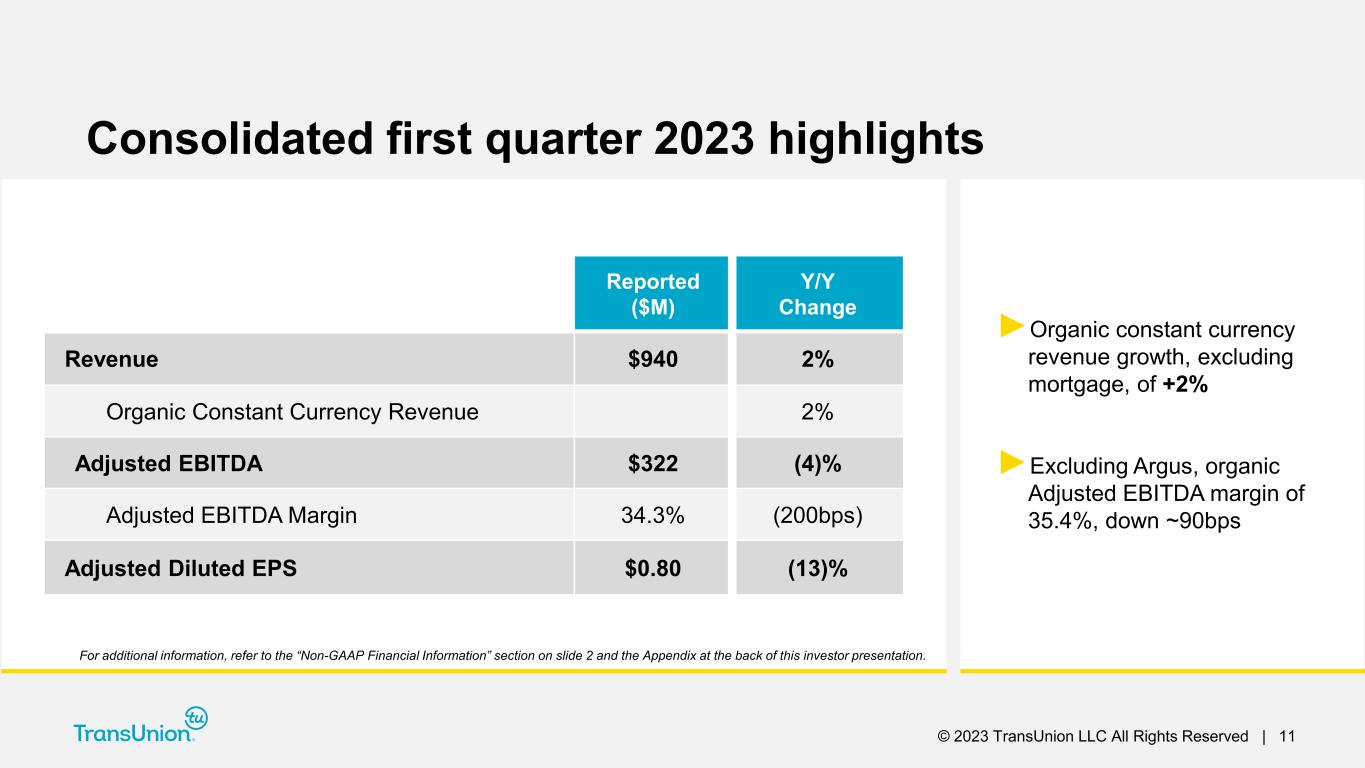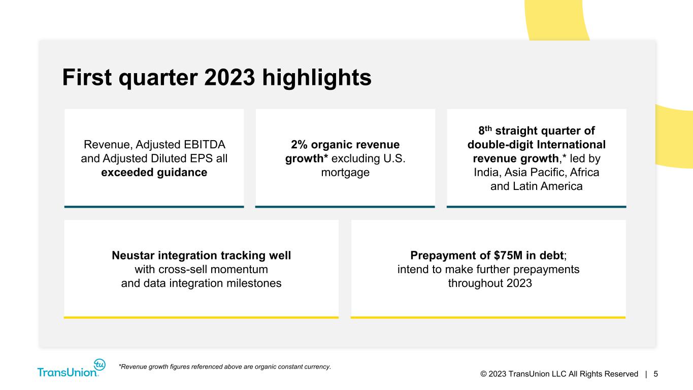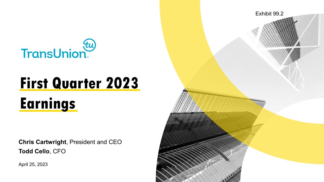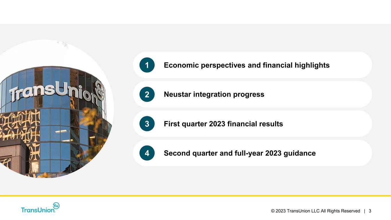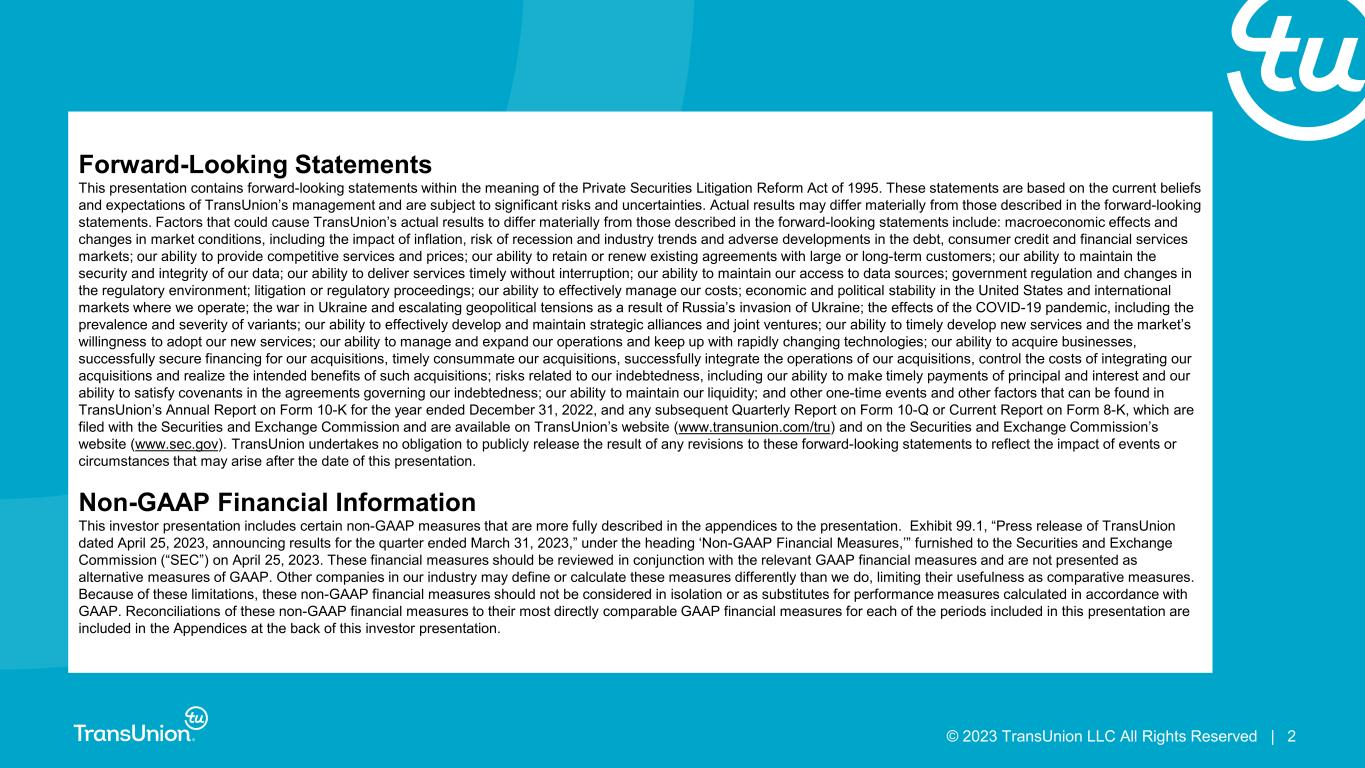 © 2023 TransUnion LLC All Rights Reserved | 2 Forward-Looking Statements This presentation contains forward-looking statements within the meaning of the Private Securities Litigation Reform Act of 1995. These statements are based on the current beliefs and expectations of TransUnion’s management and are subject to significant risks and uncertainties. Actual results may differ materially from those described in the forward-looking statements. Factors that could cause TransUnion’s actual results to differ materially from those described in the forward-looking statements include: macroeconomic effects and changes in market conditions, including the impact of inflation, risk of recession and industry trends and adverse developments in the debt, consumer credit and financial services markets; our ability to provide competitive services and prices; our ability to retain or renew existing agreements with large or long-term customers; our ability to maintain the security and integrity of our data; our ability to deliver services timely without interruption; our ability to maintain our access to data sources; government regulation and changes in the regulatory environment; litigation or regulatory proceedings; our ability to effectively manage our costs; economic and political stability in the United States and international markets where we operate; the war in Ukraine and escalating geopolitical tensions as a result of Russia’s invasion of Ukraine; the effects of the COVID-19 pandemic, including the prevalence and severity of variants; our ability to effectively develop and maintain strategic alliances and joint ventures; our ability to timely develop new services and the market’s willingness to adopt our new services; our ability to manage and expand our operations and keep up with rapidly changing technologies; our ability to acquire businesses, successfully secure financing for our acquisitions, timely consummate our acquisitions, successfully integrate the operations of our acquisitions, control the costs of integrating our acquisitions and realize the intended benefits of such acquisitions; risks related to our indebtedness, including our ability to make timely payments of principal and interest and our ability to satisfy covenants in the agreements governing our indebtedness; our ability to maintain our liquidity; and other one-time events and other factors that can be found in TransUnion’s Annual Report on Form 10-K for the year ended December 31, 2022, and any subsequent Quarterly Report on Form 10-Q or Current Report on Form 8-K, which are filed with the Securities and Exchange Commission and are available on TransUnion’s website (www.transunion.com/tru) and on the Securities and Exchange Commission’s website (www.sec.gov). TransUnion undertakes no obligation to publicly release the result of any revisions to these forward-looking statements to reflect the impact of events or circumstances that may arise after the date of this presentation. Non-GAAP Financial Information This investor presentation includes certain non-GAAP measures that are more fully described in the appendices to the presentation. Exhibit 99.1, “Press release of TransUnion dated April 25, 2023, announcing results for the quarter ended March 31, 2023,” under the heading ‘Non-GAAP Financial Measures,’” furnished to the Securities and Exchange Commission (“SEC”) on April 25, 2023. These financial measures should be reviewed in conjunction with the relevant GAAP financial measures and are not presented as alternative measures of GAAP. Other companies in our industry may define or calculate these measures differently than we do, limiting their usefulness as comparative measures. Because of these limitations, these non-GAAP financial measures should not be considered in isolation or as substitutes for performance measures calculated in accordance with GAAP. Reconciliations of these non-GAAP financial measures to their most directly comparable GAAP financial measures for each of the periods included in this presentation are included in the Appendices at the back of this investor presentation.