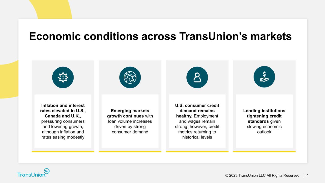 © 2023 TransUnion LLC All Rights Reserved | 3 Economic perspectives and financial highlights Neustar integration progress First quarter 2023 financial results 1 2 3 Second quarter and full-year 2023 guidance4
