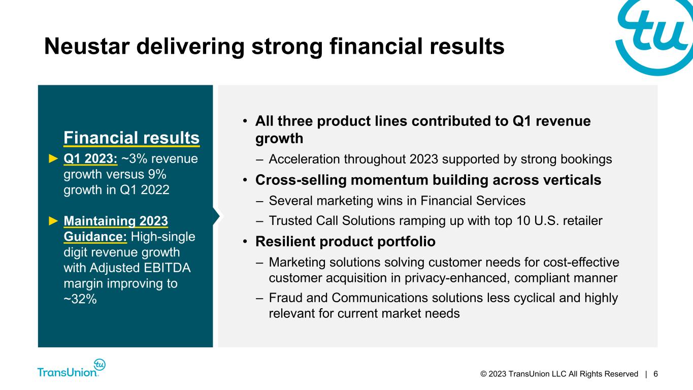 © 2023 TransUnion LLC All Rights Reserved | 5 First quarter 2023 highlights Neustar integration tracking well with cross-sell momentum and data integration milestones Prepayment of $75M in debt; intend to make further prepayments throughout 2023 Revenue, Adjusted EBITDA and Adjusted Diluted EPS all exceeded guidance 2% organic revenue growth* excluding U.S. mortgage 8th straight quarter of double-digit International revenue growth,* led by India, Asia Pacific, Africa and Latin America *Revenue growth figures referenced above are organic constant currency.