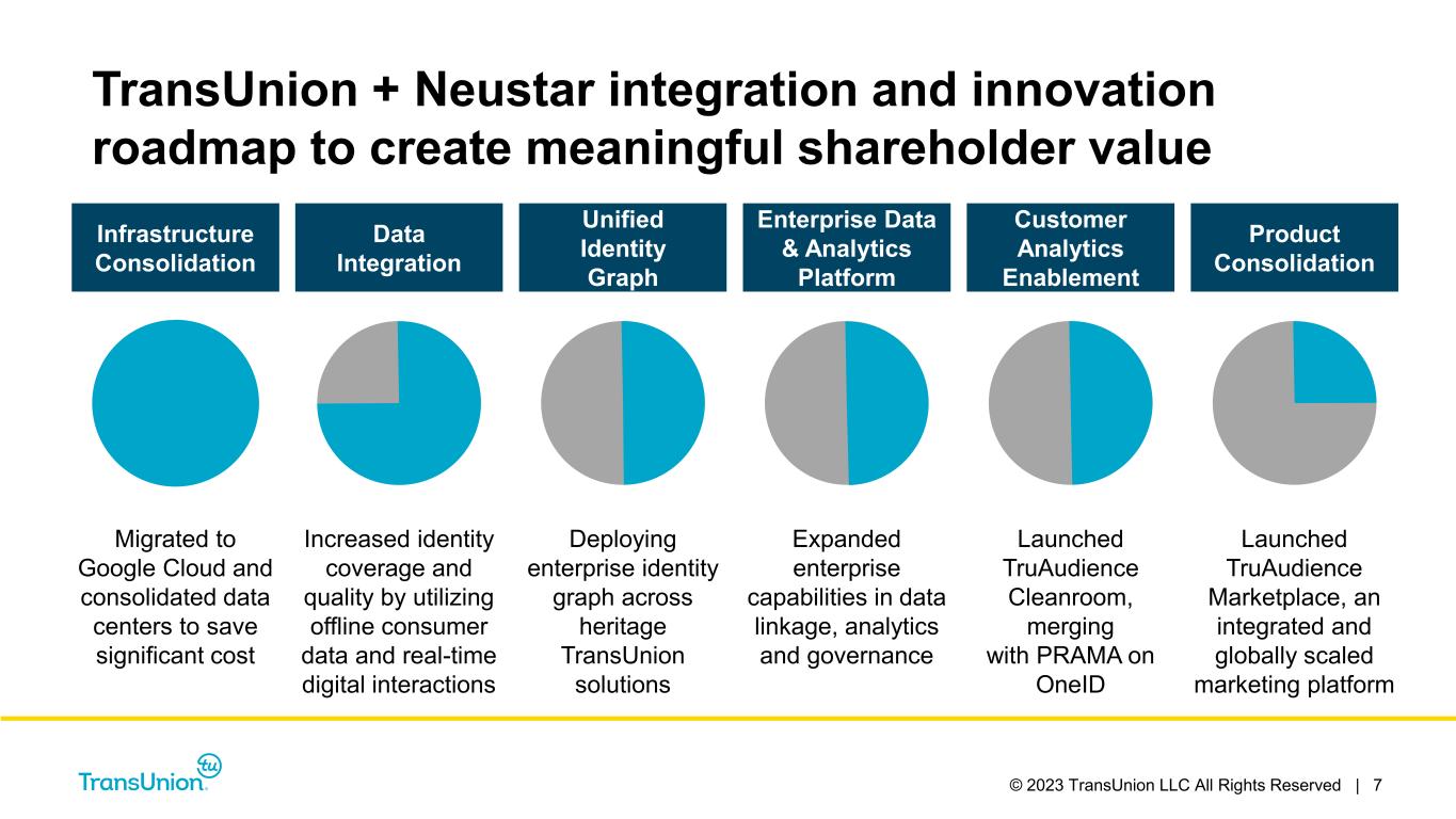 © 2023 TransUnion LLC All Rights Reserved | 6 Neustar delivering strong financial results Financial results ► Q1 2023: ~3% revenue growth versus 9% growth in Q1 2022 ► Maintaining 2023 Guidance: High-single digit revenue growth with Adjusted EBITDA margin improving to ~32% • All three product lines contributed to Q1 revenue growth – Acceleration throughout 2023 supported by strong bookings • Cross-selling momentum building across verticals – Several marketing wins in Financial Services – Trusted Call Solutions ramping up with top 10 U.S. retailer • Resilient product portfolio – Marketing solutions solving customer needs for cost-effective customer acquisition in privacy-enhanced, compliant manner – Fraud and Communications solutions less cyclical and highly relevant for current market needs