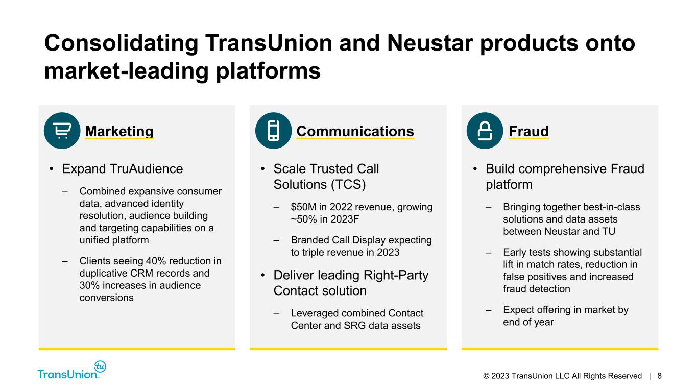 © 2023 TransUnion LLC All Rights Reserved | 7 TransUnion + Neustar integration and innovation roadmap to create meaningful shareholder value Migrated to Google Cloud and consolidated data centers to save significant cost Infrastructure Consolidation Launched TruAudience Cleanroom, merging with PRAMA on OneID Customer Analytics Enablement Increased identity coverage and quality by utilizing offline consumer data and real-time digital interactions Data Integration Launched TruAudience Marketplace, an integrated and globally scaled marketing platform Product Consolidation Deploying enterprise identity graph across heritage TransUnion solutions Unified Identity Graph Expanded enterprise capabilities in data linkage, analytics and governance Enterprise Data & Analytics Platform