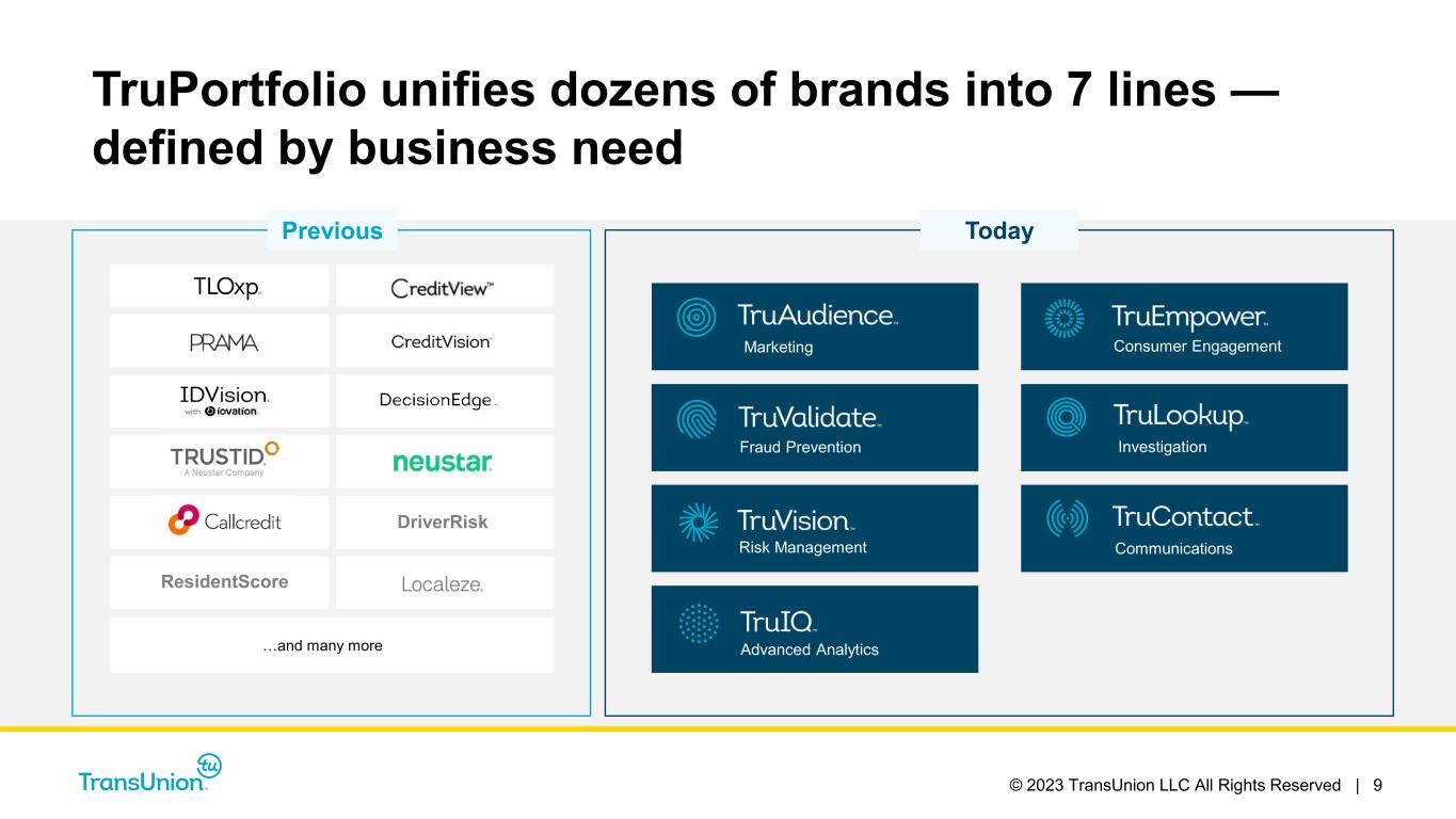 © 2023 TransUnion LLC All Rights Reserved | 9 DriverRisk ResidentScore …and many more Marketing Fraud Prevention Risk Management Advanced Analytics Investigation Communications TodayPrevious Consumer Engagement TruPortfolio unifies dozens of brands into 7 lines — defined by business need