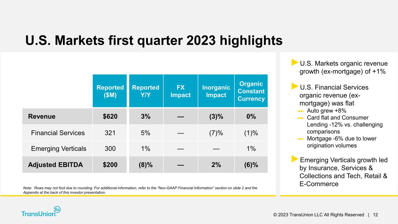 © 2023 TransUnion LLC All Rights Reserved | 11 For additional information, refer to the “Non-GAAP Financial Information” section on slide 2 and the Appendix at the back of this investor presentation. ►Organic constant currency revenue growth, excluding mortgage, of +2% ►Excluding Argus, organic Adjusted EBITDA margin of 35.4%, down ~90bps Consolidated first quarter 2023 highlights Reported ($M) Y/Y Change Revenue $940 2% Organic Constant Currency Revenue 2% Adjusted EBITDA $322 (4)% Adjusted EBITDA Margin 34.3% (200bps) Adjusted Diluted EPS $0.80 (13)%