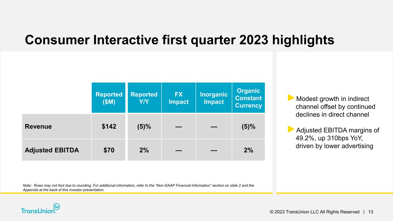 © 2023 TransUnion LLC All Rights Reserved | 12 Reported ($M) Reported Y/Y FX Impact Inorganic Impact Organic Constant Currency Revenue $620 3% — (3)% 0% Financial Services 321 5% — (7)% (1)% Emerging Verticals 300 1% — — 1% Adjusted EBITDA $200 (8)% — 2% (6)% U.S. Markets first quarter 2023 highlights ►U.S. Markets organic revenue growth (ex-mortgage) of +1% ►U.S. Financial Services organic revenue (ex- mortgage) was flat ▬ Auto grew +8% ▬ Card flat and Consumer Lending -12% vs. challenging comparisons ▬ Mortgage -6% due to lower origination volumes ►Emerging Verticals growth led by Insurance, Services & Collections and Tech, Retail & E-Commerce Note: Rows may not foot due to rounding. For additional information, refer to the “Non-GAAP Financial Information” section on slide 2 and the Appendix at the back of this investor presentation.