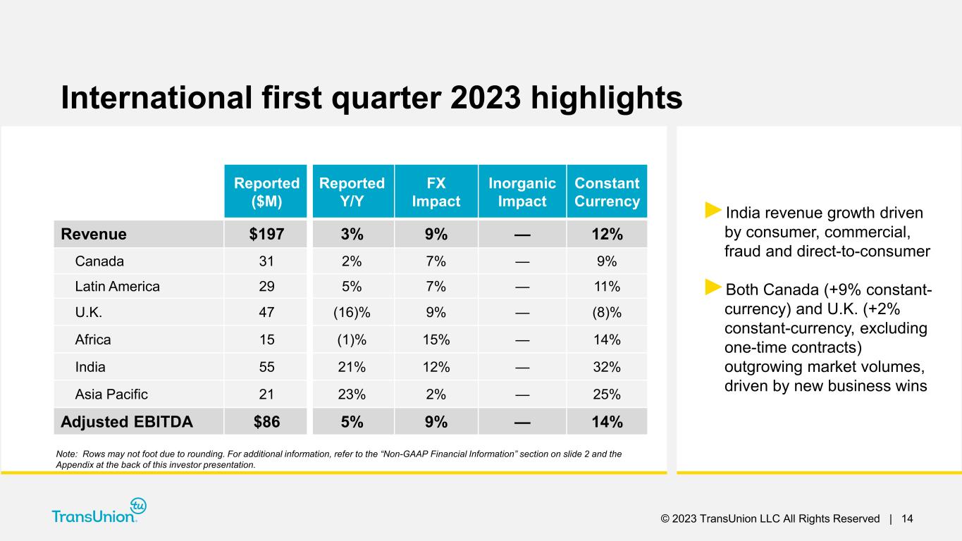 © 2023 TransUnion LLC All Rights Reserved | 13 Reported ($M) Reported Y/Y FX Impact Inorganic Impact Organic Constant Currency Revenue $142 (5)% — — (5)% Adjusted EBITDA $70 2% — — 2% Consumer Interactive first quarter 2023 highlights ►Modest growth in indirect channel offset by continued declines in direct channel ►Adjusted EBITDA margins of 49.2%, up 310bps YoY, driven by lower advertising Note: Rows may not foot due to rounding. For additional information, refer to the “Non-GAAP Financial Information” section on slide 2 and the Appendix at the back of this investor presentation.