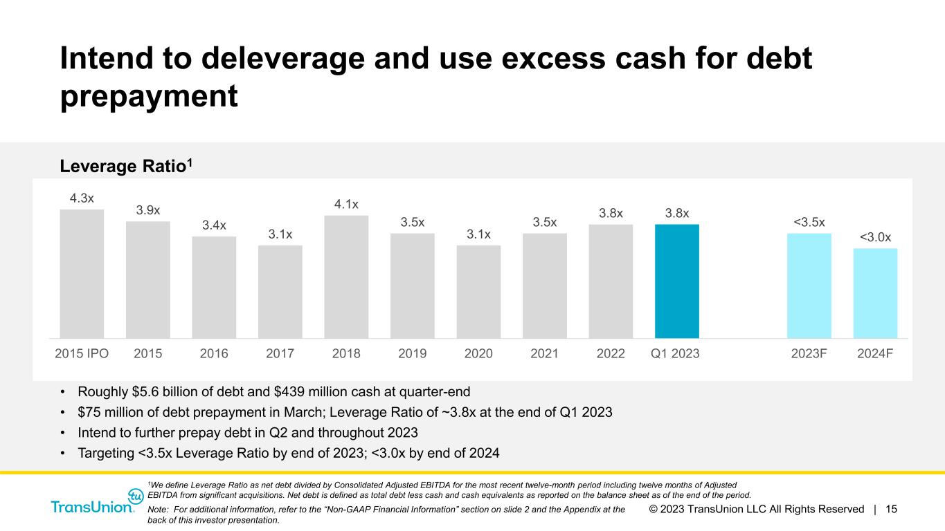 © 2023 TransUnion LLC All Rights Reserved | 14 Reported ($M) Reported Y/Y FX Impact Inorganic Impact Constant Currency Revenue $197 3% 9% — 12% Canada 31 2% 7% — 9% Latin America 29 5% 7% — 11% U.K. 47 (16)% 9% — (8)% Africa 15 (1)% 15% — 14% India 55 21% 12% — 32% Asia Pacific 21 23% 2% — 25% Adjusted EBITDA $86 5% 9% — 14% International first quarter 2023 highlights ►India revenue growth driven by consumer, commercial, fraud and direct-to-consumer ►Both Canada (+9% constant- currency) and U.K. (+2% constant-currency, excluding one-time contracts) outgrowing market volumes, driven by new business wins Note: Rows may not foot due to rounding. For additional information, refer to the “Non-GAAP Financial Information” section on slide 2 and the Appendix at the back of this investor presentation.