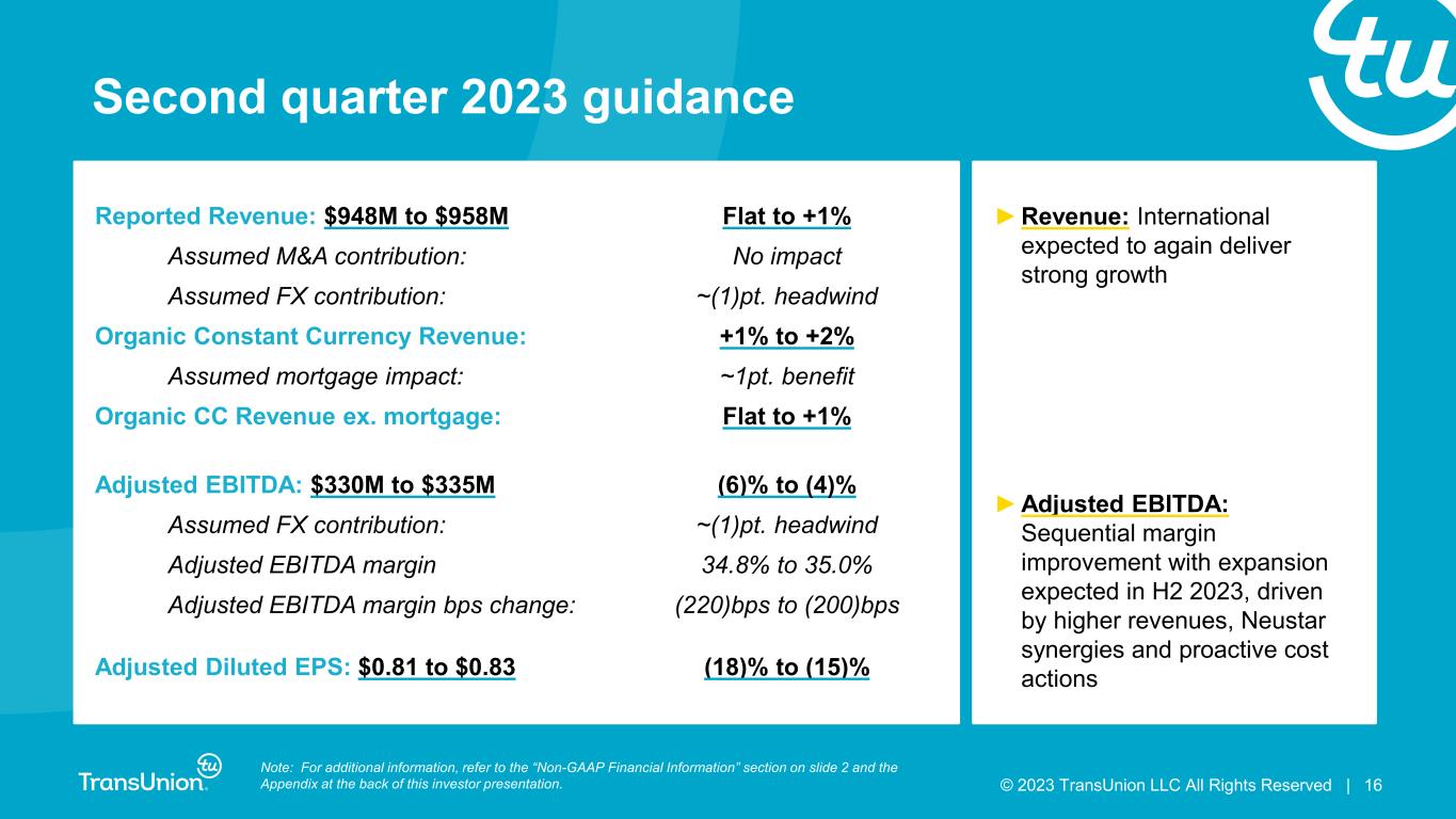 © 2023 TransUnion LLC All Rights Reserved | 15 • Roughly $5.6 billion of debt and $439 million cash at quarter-end • $75 million of debt prepayment in March; Leverage Ratio of ~3.8x at the end of Q1 2023 • Intend to further prepay debt in Q2 and throughout 2023 • Targeting <3.5x Leverage Ratio by end of 2023; <3.0x by end of 2024 Leverage Ratio1 1We define Leverage Ratio as net debt divided by Consolidated Adjusted EBITDA for the most recent twelve-month period including twelve months of Adjusted EBITDA from significant acquisitions. Net debt is defined as total debt less cash and cash equivalents as reported on the balance sheet as of the end of the period. 4.3x 3.9x 3.4x 3.1x 4.1x 3.5x 3.1x 3.5x 3.8x 3.8x <3.5x <3.0x 2015 IPO 2015 2016 2017 2018 2019 2020 2021 2022 Q1 2023 2023F 2024F Note: For additional information, refer to the “Non-GAAP Financial Information” section on slide 2 and the Appendix at the back of this investor presentation. Intend to deleverage and use excess cash for debt prepayment
