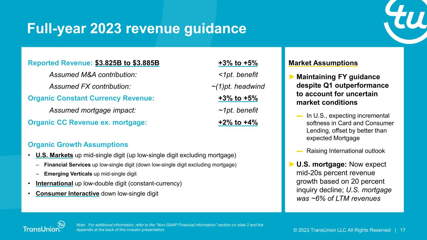 © 2023 TransUnion LLC All Rights Reserved | 16 Reported Revenue: $948M to $958M Flat to +1% Assumed M&A contribution: No impact Assumed FX contribution: ~(1)pt. headwind Organic Constant Currency Revenue: +1% to +2% Assumed mortgage impact: ~1pt. benefit Organic CC Revenue ex. mortgage: Flat to +1% Adjusted EBITDA: $330M to $335M (6)% to (4)% Assumed FX contribution: ~(1)pt. headwind Adjusted EBITDA margin 34.8% to 35.0% Adjusted EBITDA margin bps change: (220)bps to (200)bps Adjusted Diluted EPS: $0.81 to $0.83 (18)% to (15)% Note: For additional information, refer to the “Non-GAAP Financial Information” section on slide 2 and the Appendix at the back of this investor presentation. Second quarter 2023 guidance ►Revenue: International expected to again deliver strong growth ►Adjusted EBITDA: Sequential margin improvement with expansion expected in H2 2023, driven by higher revenues, Neustar synergies and proactive cost actions