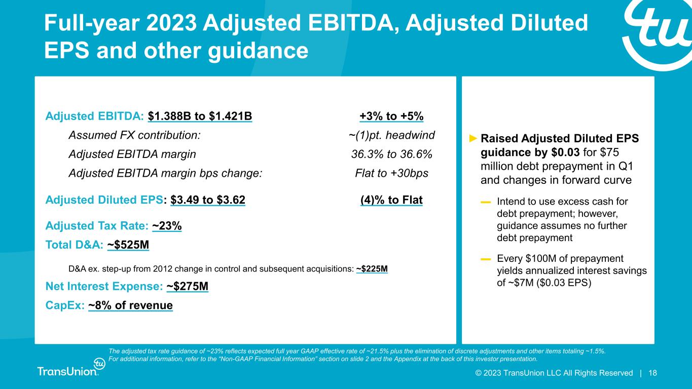 © 2023 TransUnion LLC All Rights Reserved | 17 Reported Revenue: $3.825B to $3.885B +3% to +5% Assumed M&A contribution: <1pt. benefit Assumed FX contribution: ~(1)pt. headwind Organic Constant Currency Revenue: +3% to +5% Assumed mortgage impact: ~1pt. benefit Organic CC Revenue ex. mortgage: +2% to +4% Organic Growth Assumptions • U.S. Markets up mid-single digit (up low-single digit excluding mortgage) – Financial Services up low-single digit (down low-single digit excluding mortgage) – Emerging Verticals up mid-single digit • International up low-double digit (constant-currency) • Consumer Interactive down low-single digit Market Assumptions ►Maintaining FY guidance despite Q1 outperformance to account for uncertain market conditions ▬ In U.S., expecting incremental softness in Card and Consumer Lending, offset by better than expected Mortgage ▬ Raising International outlook ►U.S. mortgage: Now expect mid-20s percent revenue growth based on 20 percent inquiry decline; U.S. mortgage was ~6% of LTM revenues Full-year 2023 revenue guidance Note: For additional information, refer to the “Non-GAAP Financial Information” section on slide 2 and the Appendix at the back of this investor presentation.