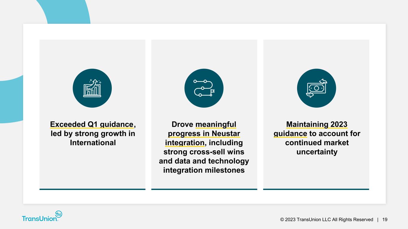 © 2023 TransUnion LLC All Rights Reserved | 18 ►Raised Adjusted Diluted EPS guidance by $0.03 for $75 million debt prepayment in Q1 and changes in forward curve ▬ Intend to use excess cash for debt prepayment; however, guidance assumes no further debt prepayment ▬ Every $100M of prepayment yields annualized interest savings of ~$7M ($0.03 EPS) Adjusted EBITDA: $1.388B to $1.421B +3% to +5% Assumed FX contribution: ~(1)pt. headwind Adjusted EBITDA margin 36.3% to 36.6% Adjusted EBITDA margin bps change: Flat to +30bps Adjusted Diluted EPS: $3.49 to $3.62 (4)% to Flat Adjusted Tax Rate: ~23% Total D&A: ~$525M D&A ex. step-up from 2012 change in control and subsequent acquisitions: ~$225M Net Interest Expense: ~$275M CapEx: ~8% of revenue The adjusted tax rate guidance of ~23% reflects expected full year GAAP effective rate of ~21.5% plus the elimination of discrete adjustments and other items totaling ~1.5%. For additional information, refer to the “Non-GAAP Financial Information” section on slide 2 and the Appendix at the back of this investor presentation. Full-year 2023 Adjusted EBITDA, Adjusted Diluted EPS and other guidance