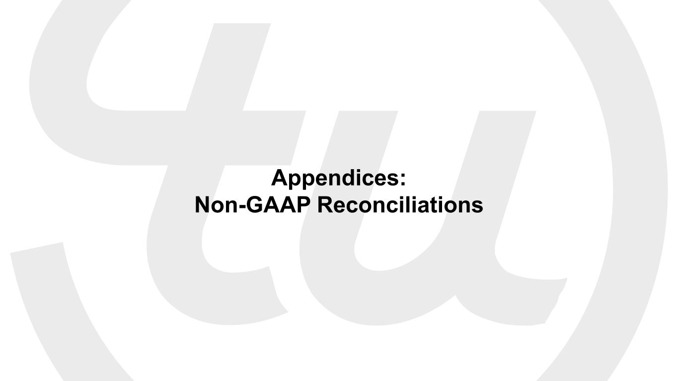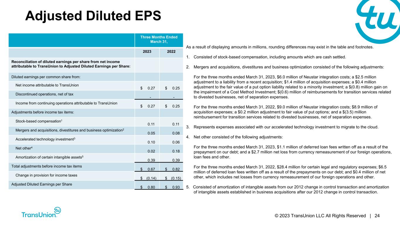 © 2023 TransUnion LLC All Rights Reserved | 23 Adjusted Net Income and Adjusted EPS $ in millions, except per share data Three Months Ended March 31, 2023 2022 Reconciliation of net income attributable to TransUnion to Adjusted Net Income: Net income attributable to TransUnion $ 52.6 $ 48.3 Discontinued operations, net of tax 0.1 0.4 Income from continuing operations attributable to TransUnion $ 52.7 $ 48.7 Adjustments before income tax items: Stock-based compensation1 22.2 20.6 Mergers and acquisitions, divestitures and business optimization2 8.9 14.6 Accelerated technology investment3 19.7 12.0 Net other4 3.8 35.3 Amortization of certain intangible assets5 75.2 76.2 Total adjustments before income tax items $ 129.7 $ 158.7 Change in provision for income taxes $ (26.9) $ (28.5) Adjusted Net Income $ 155.4 $ 178.8 Weighted-average shares outstanding: Basic 193.0 192.1 Diluted 193.9 193.2 Adjusted Earnings per Share: Basic $ 0.81 $ 0.93 Diluted $ 0.80 $ 0.93 As a result of displaying amounts in millions, rounding differences may exist in the table and footnotes. 1. Consisted of stock-based compensation, including amounts which are cash settled. 2. Mergers and acquisitions, divestitures and business optimization consisted of the following adjustments: For the three months ended March 31, 2023, $6.0 million of Neustar integration costs; a $2.5 million adjustment to a liability from a recent acquisition; $1.4 million of acquisition expenses; a $0.4 million adjustment to the fair value of a put option liability related to a minority investment; a $(0.8) million gain on the impairment of a Cost Method Investment; $(0.6) million of reimbursements for transition services related to divested businesses, net of separation expenses. For the three months ended March 31, 2022, $9.0 million of Neustar integration costs; $8.9 million of acquisition expenses; a $0.2 million adjustment to fair value of put options; and a $(3.5) million reimbursement for transition services related to divested businesses, net of separation expenses. 3. Represents expenses associated with our accelerated technology investment to migrate to the cloud. 4. Net other consisted of the following adjustments: For the three months ended March 31, 2023, $1.1 million of deferred loan fees written off as a result of the prepayment on our debt; and a $2.7 million net loss from currency remeasurement of our foreign operations, loan fees and other. For the three months ended March 31, 2022, $28.4 million for certain legal and regulatory expenses; $6.5 million of deferred loan fees written off as a result of the prepayments on our debt; and $0.4 million of net other, which includes net losses from currency remeasurement of our foreign operations and other. 5. Consisted of amortization of intangible assets from our 2012 change in control transaction and amortization of intangible assets established in business acquisitions after our 2012 change in control transaction.