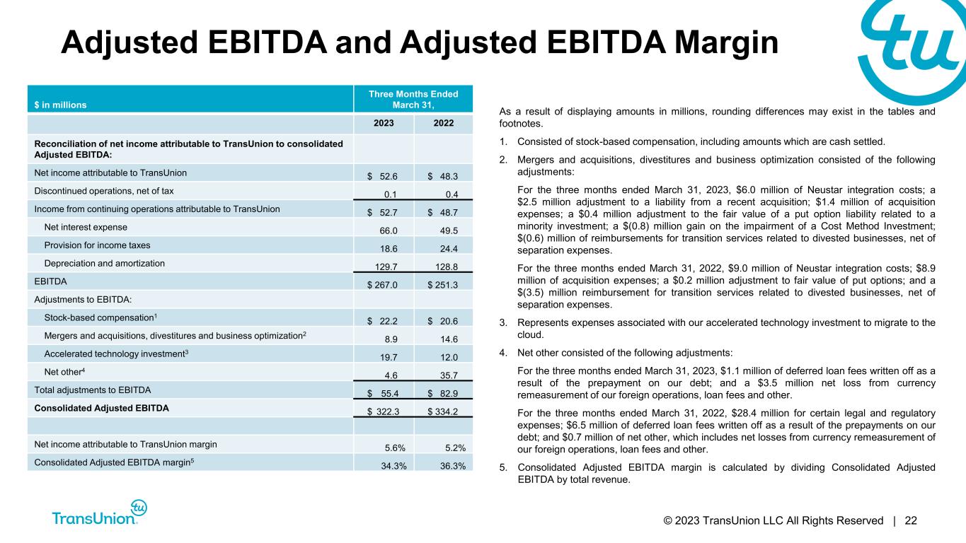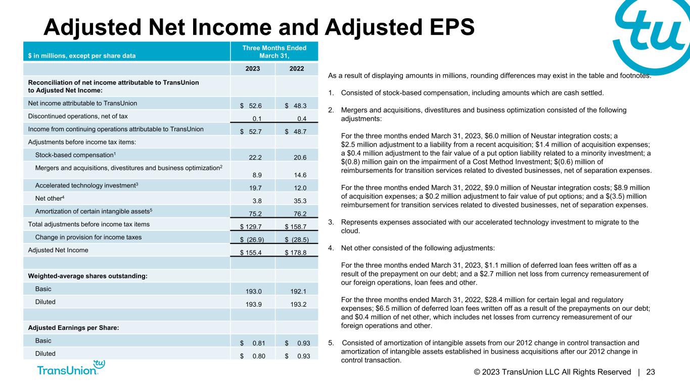 © 2023 TransUnion LLC All Rights Reserved | 22 Adjusted EBITDA and Adjusted EBITDA Margin $ in millions Three Months Ended March 31, 2023 2022 Reconciliation of net income attributable to TransUnion to consolidated Adjusted EBITDA: Net income attributable to TransUnion $ 52.6 $ 48.3 Discontinued operations, net of tax 0.1 0.4 Income from continuing operations attributable to TransUnion $ 52.7 $ 48.7 Net interest expense 66.0 49.5 Provision for income taxes 18.6 24.4 Depreciation and amortization 129.7 128.8 EBITDA $ 267.0 $ 251.3 Adjustments to EBITDA: Stock-based compensation1 $ 22.2 $ 20.6 Mergers and acquisitions, divestitures and business optimization2 8.9 14.6 Accelerated technology investment3 19.7 12.0 Net other4 4.6 35.7 Total adjustments to EBITDA $ 55.4 $ 82.9 Consolidated Adjusted EBITDA $ 322.3 $ 334.2 Net income attributable to TransUnion margin 5.6% 5.2% Consolidated Adjusted EBITDA margin5 34.3% 36.3% As a result of displaying amounts in millions, rounding differences may exist in the tables and footnotes. 1. Consisted of stock-based compensation, including amounts which are cash settled. 2. Mergers and acquisitions, divestitures and business optimization consisted of the following adjustments: For the three months ended March 31, 2023, $6.0 million of Neustar integration costs; a $2.5 million adjustment to a liability from a recent acquisition; $1.4 million of acquisition expenses; a $0.4 million adjustment to the fair value of a put option liability related to a minority investment; a $(0.8) million gain on the impairment of a Cost Method Investment; $(0.6) million of reimbursements for transition services related to divested businesses, net of separation expenses. For the three months ended March 31, 2022, $9.0 million of Neustar integration costs; $8.9 million of acquisition expenses; a $0.2 million adjustment to fair value of put options; and a $(3.5) million reimbursement for transition services related to divested businesses, net of separation expenses. 3. Represents expenses associated with our accelerated technology investment to migrate to the cloud. 4. Net other consisted of the following adjustments: For the three months ended March 31, 2023, $1.1 million of deferred loan fees written off as a result of the prepayment on our debt; and a $3.5 million net loss from currency remeasurement of our foreign operations, loan fees and other. For the three months ended March 31, 2022, $28.4 million for certain legal and regulatory expenses; $6.5 million of deferred loan fees written off as a result of the prepayments on our debt; and $0.7 million of net other, which includes net losses from currency remeasurement of our foreign operations, loan fees and other. 5. Consolidated Adjusted EBITDA margin is calculated by dividing Consolidated Adjusted EBITDA by total revenue.