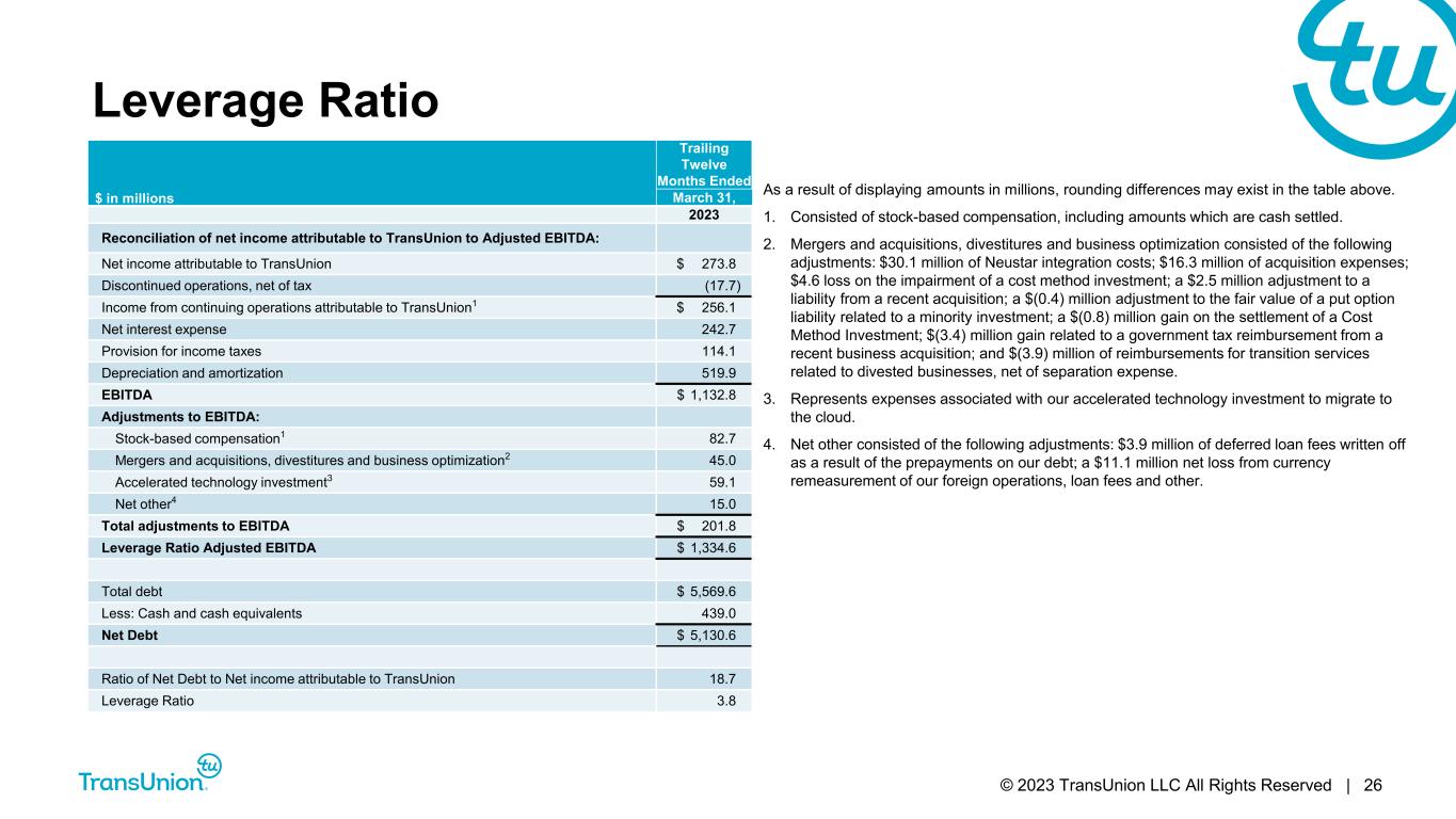 © 2023 TransUnion LLC All Rights Reserved | 25 Adjusted Effective Tax Rate $ in millions Three Months Ended March 31, 2023 2022 Income from continuing operations before income taxes $ 75.6 $ 76.7 Total adjustments before income tax items 129.7 158.7 Adjusted income from continuing operations before income taxes $ 205.2 $ 235.3 Provision for income taxes (18.6) (24.4) Adjustments for income taxes: Tax effect of above adjustments1 (29.6) (28.4) Eliminate impact of excess tax expenses/(benefits) for share compensation 1.5 (4.2) Other2 1.2 4.1 Total adjustments for income taxes $ (26.9) $ (28.5) Adjusted provision for income taxes $ (45.5) $ (52.9) Effective tax rate 24.6% 31.8% Adjusted Effective Tax Rate 22.2% 22.5% As a result of displaying amounts in millions, rounding differences may exist in the table. 1. Tax rates used to calculate the tax expense impact are based on the nature of each item. 2. For the three months ended March 31, 2023, $0.9 million of other adjustments, $0.4 million of deferred tax rate adjustments, and ($0.1) million of valuation allowances related to prior periods. For the three months ended March 31, 2022, $2.1 million of deferred tax rate adjustments; $0.6 million of return to provision and audit adjustments related to prior periods; $0.9 million of other adjustments, and $0.5 million of valuation allowances.