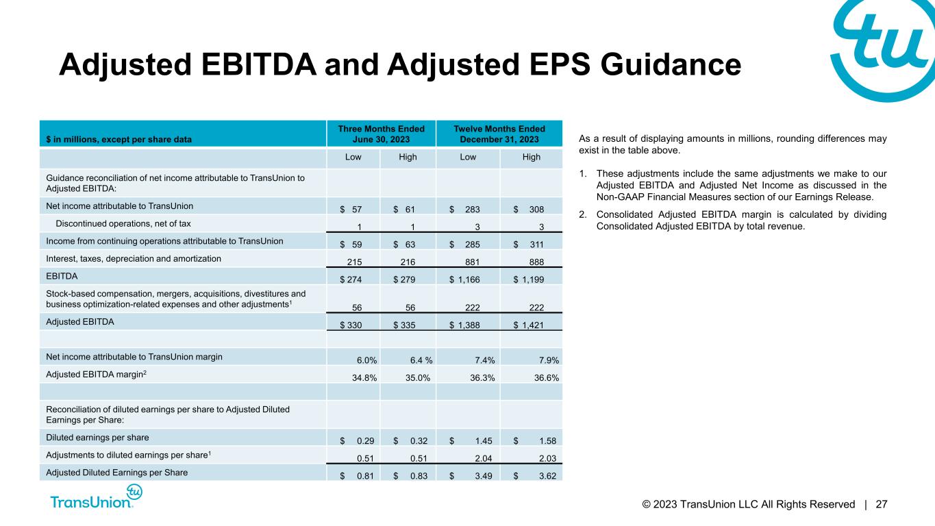 © 2023 TransUnion LLC All Rights Reserved | 26 Leverage Ratio $ in millions Trailing Twelve Months Ended March 31, 2023 Reconciliation of net income attributable to TransUnion to Adjusted EBITDA: Net income attributable to TransUnion $ 273.8 Discontinued operations, net of tax (17.7) Income from continuing operations attributable to TransUnion1 $ 256.1 Net interest expense 242.7 Provision for income taxes 114.1 Depreciation and amortization 519.9 EBITDA $ 1,132.8 Adjustments to EBITDA: Stock-based compensation1 82.7 Mergers and acquisitions, divestitures and business optimization2 45.0 Accelerated technology investment3 59.1 Net other4 15.0 Total adjustments to EBITDA $ 201.8 Leverage Ratio Adjusted EBITDA $ 1,334.6 Total debt $ 5,569.6 Less: Cash and cash equivalents 439.0 Net Debt $ 5,130.6 Ratio of Net Debt to Net income attributable to TransUnion 18.7 Leverage Ratio 3.8 As a result of displaying amounts in millions, rounding differences may exist in the table above. 1. Consisted of stock-based compensation, including amounts which are cash settled. 2. Mergers and acquisitions, divestitures and business optimization consisted of the following adjustments: $30.1 million of Neustar integration costs; $16.3 million of acquisition expenses; $4.6 loss on the impairment of a cost method investment; a $2.5 million adjustment to a liability from a recent acquisition; a $(0.4) million adjustment to the fair value of a put option liability related to a minority investment; a $(0.8) million gain on the settlement of a Cost Method Investment; $(3.4) million gain related to a government tax reimbursement from a recent business acquisition; and $(3.9) million of reimbursements for transition services related to divested businesses, net of separation expense. 3. Represents expenses associated with our accelerated technology investment to migrate to the cloud. 4. Net other consisted of the following adjustments: $3.9 million of deferred loan fees written off as a result of the prepayments on our debt; a $11.1 million net loss from currency remeasurement of our foreign operations, loan fees and other.