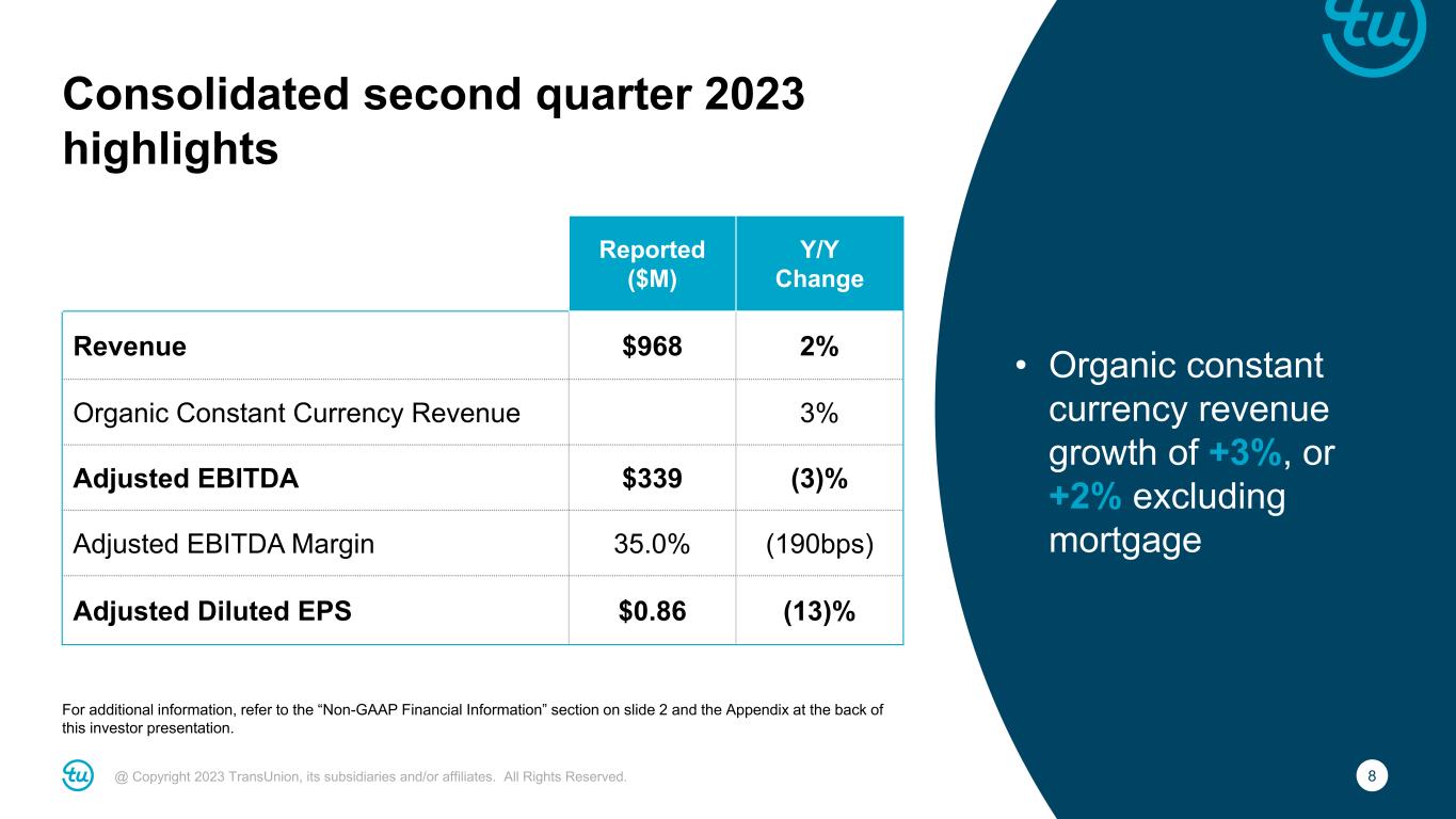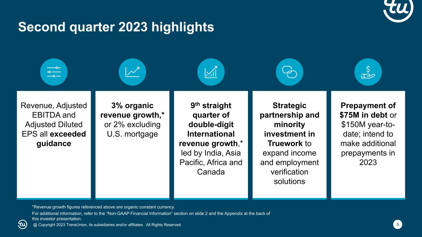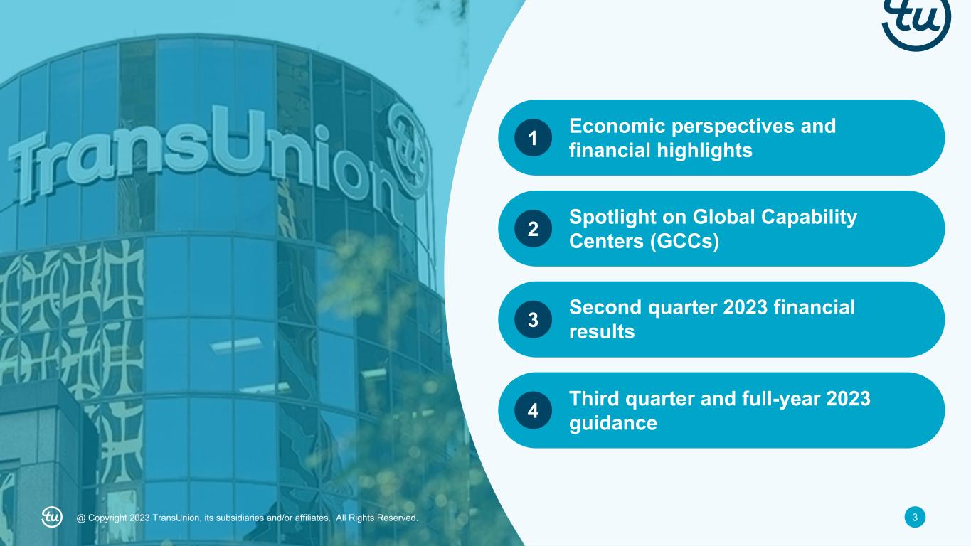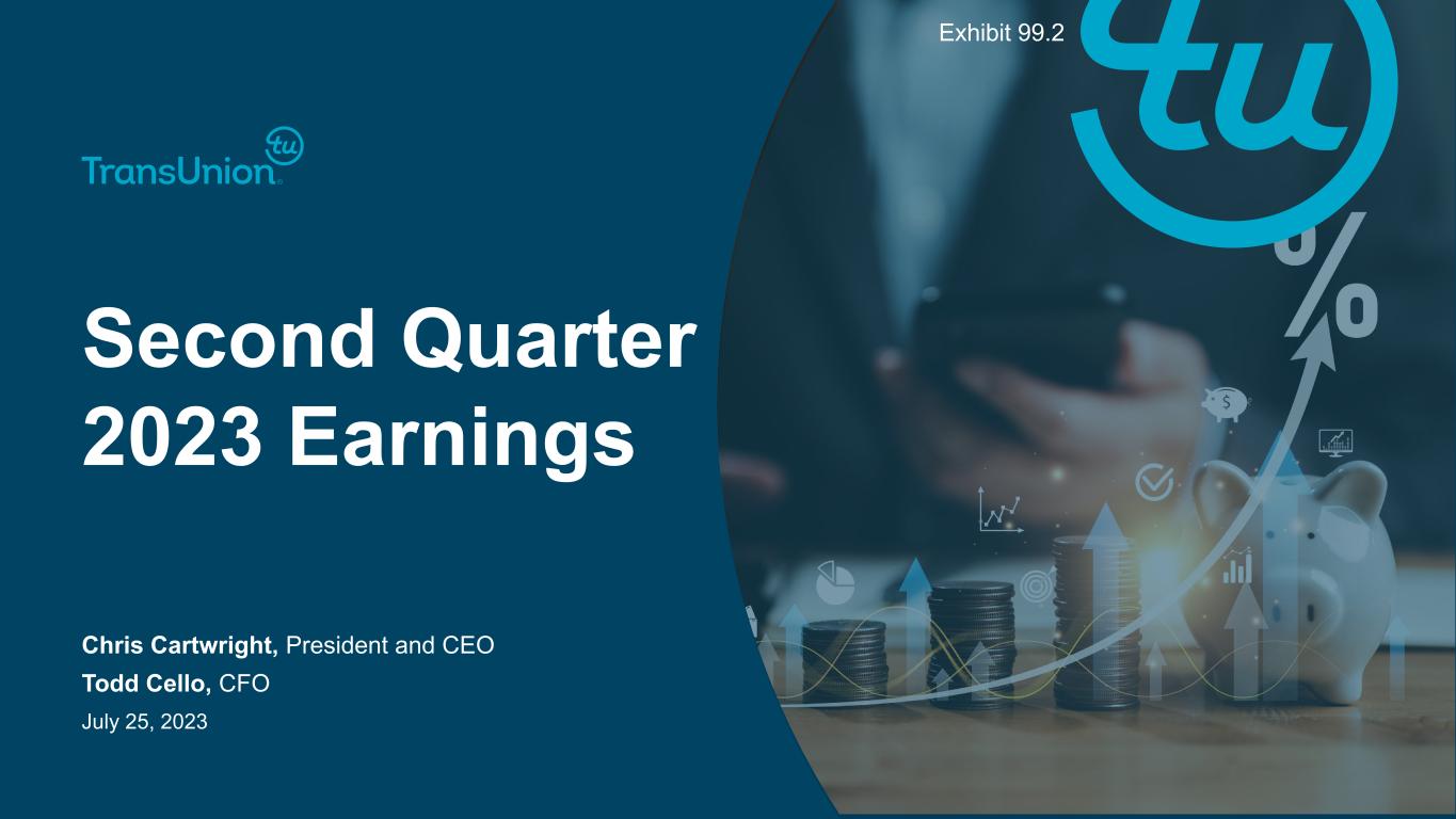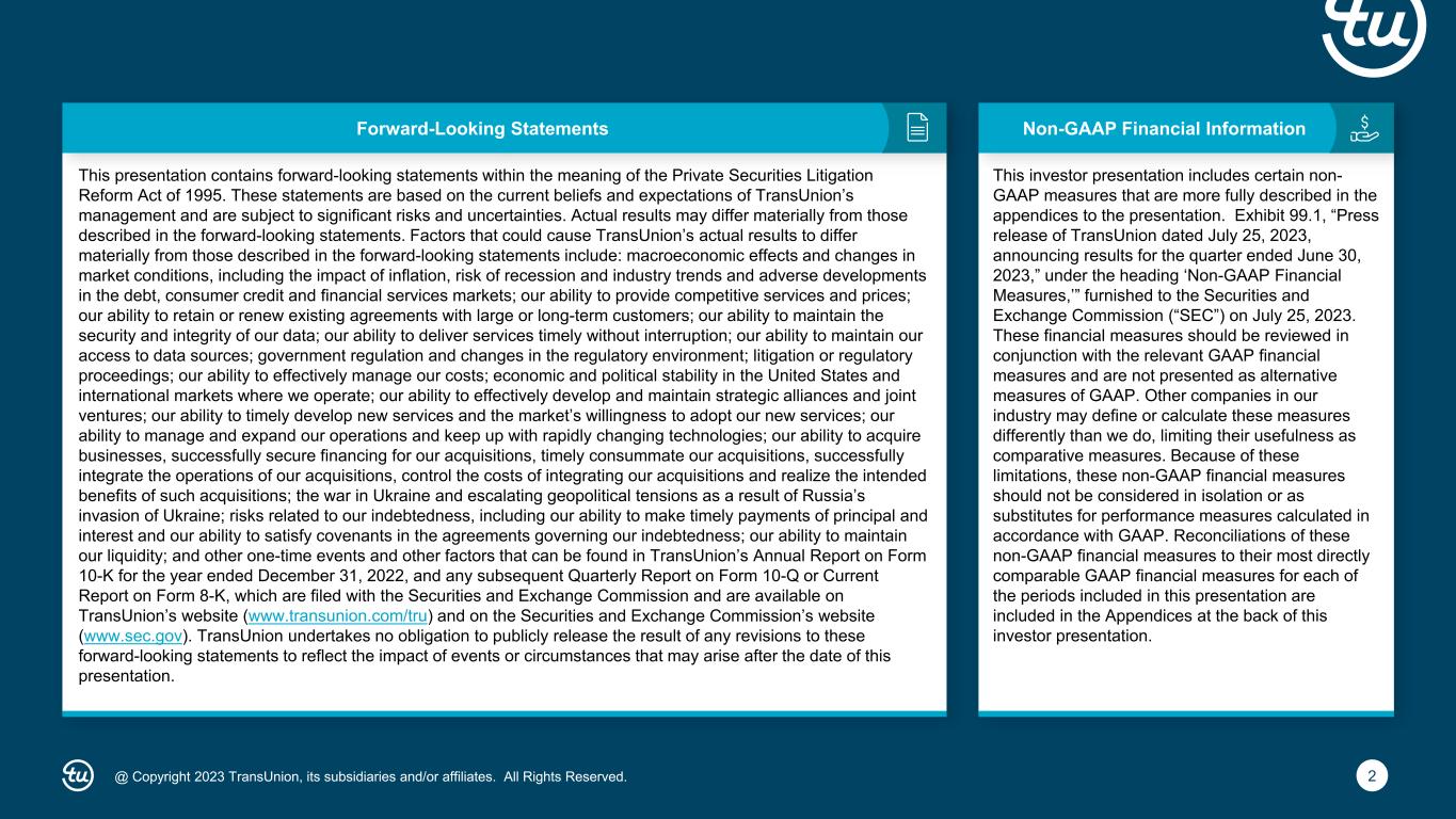 2@ Copyright 2023 TransUnion, its subsidiaries and/or affiliates. All Rights Reserved. Non-GAAP Financial InformationForward-Looking Statements This presentation contains forward-looking statements within the meaning of the Private Securities Litigation Reform Act of 1995. These statements are based on the current beliefs and expectations of TransUnion’s management and are subject to significant risks and uncertainties. Actual results may differ materially from those described in the forward-looking statements. Factors that could cause TransUnion’s actual results to differ materially from those described in the forward-looking statements include: macroeconomic effects and changes in market conditions, including the impact of inflation, risk of recession and industry trends and adverse developments in the debt, consumer credit and financial services markets; our ability to provide competitive services and prices; our ability to retain or renew existing agreements with large or long-term customers; our ability to maintain the security and integrity of our data; our ability to deliver services timely without interruption; our ability to maintain our access to data sources; government regulation and changes in the regulatory environment; litigation or regulatory proceedings; our ability to effectively manage our costs; economic and political stability in the United States and international markets where we operate; our ability to effectively develop and maintain strategic alliances and joint ventures; our ability to timely develop new services and the market’s willingness to adopt our new services; our ability to manage and expand our operations and keep up with rapidly changing technologies; our ability to acquire businesses, successfully secure financing for our acquisitions, timely consummate our acquisitions, successfully integrate the operations of our acquisitions, control the costs of integrating our acquisitions and realize the intended benefits of such acquisitions; the war in Ukraine and escalating geopolitical tensions as a result of Russia’s invasion of Ukraine; risks related to our indebtedness, including our ability to make timely payments of principal and interest and our ability to satisfy covenants in the agreements governing our indebtedness; our ability to maintain our liquidity; and other one-time events and other factors that can be found in TransUnion’s Annual Report on Form 10-K for the year ended December 31, 2022, and any subsequent Quarterly Report on Form 10-Q or Current Report on Form 8-K, which are filed with the Securities and Exchange Commission and are available on TransUnion’s website (www.transunion.com/tru) and on the Securities and Exchange Commission’s website (www.sec.gov). TransUnion undertakes no obligation to publicly release the result of any revisions to these forward-looking statements to reflect the impact of events or circumstances that may arise after the date of this presentation. This investor presentation includes certain non- GAAP measures that are more fully described in the appendices to the presentation. Exhibit 99.1, “Press release of TransUnion dated July 25, 2023, announcing results for the quarter ended June 30, 2023,” under the heading ‘Non-GAAP Financial Measures,’” furnished to the Securities and Exchange Commission (“SEC”) on July 25, 2023. These financial measures should be reviewed in conjunction with the relevant GAAP financial measures and are not presented as alternative measures of GAAP. Other companies in our industry may define or calculate these measures differently than we do, limiting their usefulness as comparative measures. Because of these limitations, these non-GAAP financial measures should not be considered in isolation or as substitutes for performance measures calculated in accordance with GAAP. Reconciliations of these non-GAAP financial measures to their most directly comparable GAAP financial measures for each of the periods included in this presentation are included in the Appendices at the back of this investor presentation.