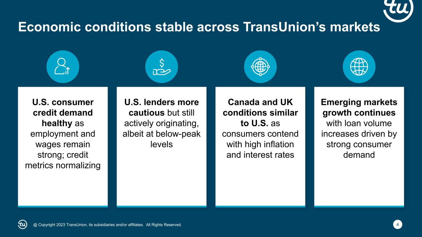 3@ Copyright 2023 TransUnion, its subsidiaries and/or affiliates. All Rights Reserved. Economic perspectives and financial highlights Spotlight on Global Capability Centers (GCCs) Second quarter 2023 financial results 1 2 3 Third quarter and full-year 2023 guidance4