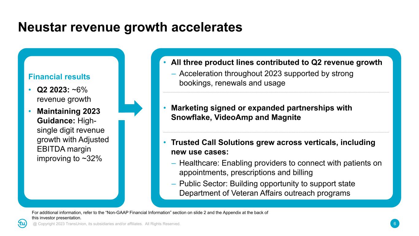 5@ Copyright 2023 TransUnion, its subsidiaries and/or affiliates. All Rights Reserved. *Revenue growth figures referenced above are organic constant currency. Second quarter 2023 highlights Revenue, Adjusted EBITDA and Adjusted Diluted EPS all exceeded guidance 3% organic revenue growth,* or 2% excluding U.S. mortgage 9th straight quarter of double-digit International revenue growth,* led by India, Asia Pacific, Africa and Canada Strategic partnership and minority investment in Truework to expand income and employment verification solutions Prepayment of $75M in debt or $150M year-to- date; intend to make additional prepayments in 2023 For additional information, refer to the “Non-GAAP Financial Information” section on slide 2 and the Appendix at the back of this investor presentation.