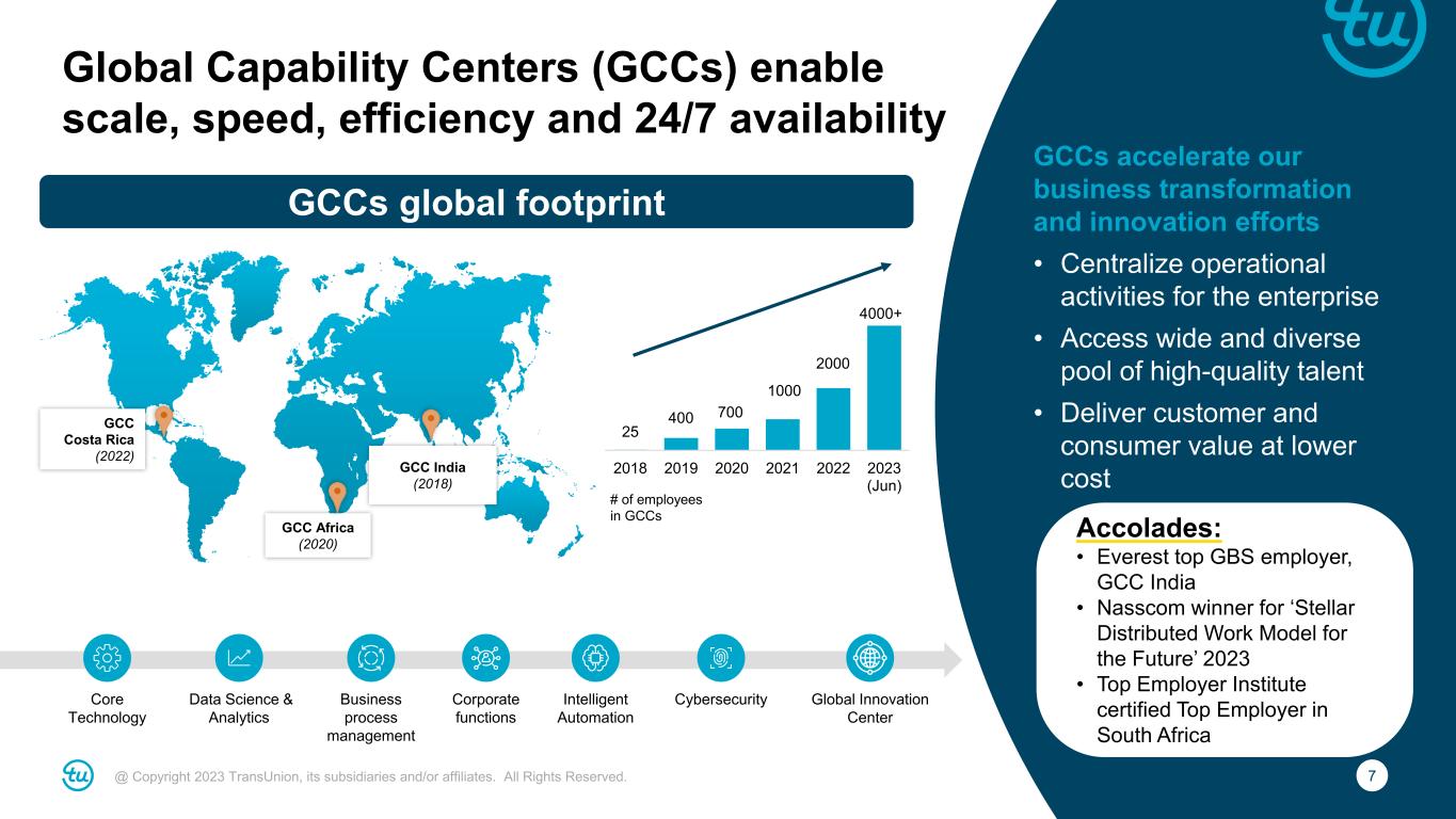 7@ Copyright 2023 TransUnion, its subsidiaries and/or affiliates. All Rights Reserved. GCCs accelerate our business transformation and innovation efforts • Centralize operational activities for the enterprise • Access wide and diverse pool of high-quality talent • Deliver customer and consumer value at lower cost Global Capability Centers (GCCs) enable scale, speed, efficiency and 24/7 availability 25 400 700 1000 2000 4000+ 2018 2019 2020 2021 2022 2023 (Jun) Core Technology Data Science & Analytics Business process management Corporate functions Intelligent Automation Cybersecurity Global Innovation Center GCC Africa (2020) GCC Costa Rica (2022) # of employees in GCCs Accolades: • Everest top GBS employer, GCC India • Nasscom winner for ‘Stellar Distributed Work Model for the Future’ 2023 • Top Employer Institute certified Top Employer in South Africa GCCs global footprint GCC India (2018)