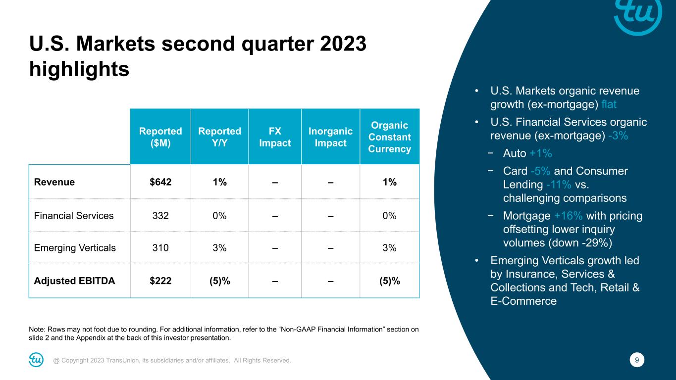 8@ Copyright 2023 TransUnion, its subsidiaries and/or affiliates. All Rights Reserved. Consolidated second quarter 2023 highlights For additional information, refer to the “Non-GAAP Financial Information” section on slide 2 and the Appendix at the back of this investor presentation. Reported ($M) Y/Y Change Revenue $968 2% Organic Constant Currency Revenue 3% Adjusted EBITDA $339 (3)% Adjusted EBITDA Margin 35.0% (190bps) Adjusted Diluted EPS $0.86 (13)% • Organic constant currency revenue growth of +3%, or +2% excluding mortgage