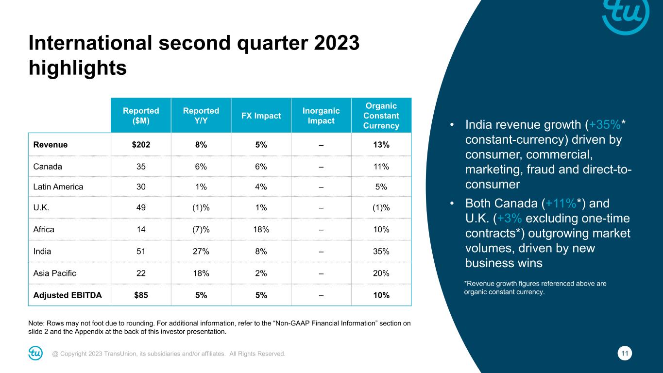 10@ Copyright 2023 TransUnion, its subsidiaries and/or affiliates. All Rights Reserved. Consumer Interactive second quarter 2023 highlights Note: Rows may not foot due to rounding. For additional information, refer to the “Non-GAAP Financial Information” section on slide 2 and the Appendix at the back of this investor presentation. • Indirect channel and Sontiq growth offset by continued, but moderating, declines in direct channel • Adjusted EBITDA margin of 47.0%, up 80bps YoY, driven by lower advertising Reported ($M) Reported Y/Y FX Impact Inorganic Impact Organic Constant Currency Revenue $144 (2)% – – (2)% Adjusted EBITDA $68 0% – – 0%