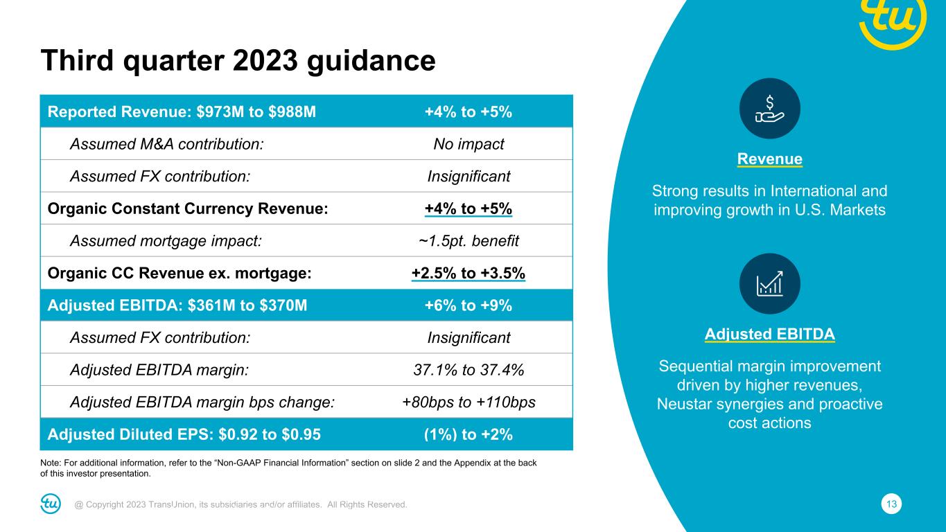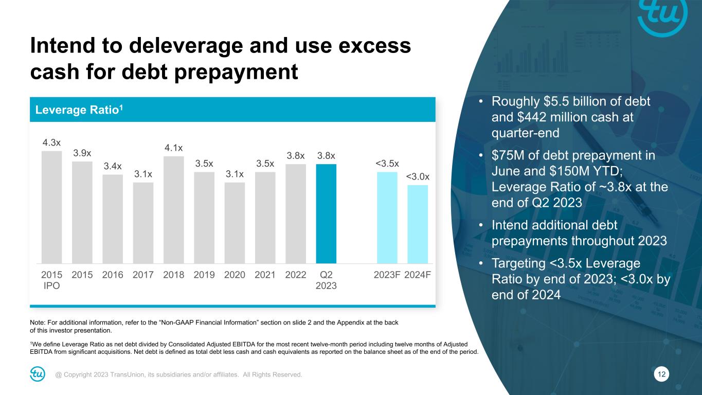 12@ Copyright 2023 TransUnion, its subsidiaries and/or affiliates. All Rights Reserved. • Roughly $5.5 billion of debt and $442 million cash at quarter-end • $75M of debt prepayment in June and $150M YTD; Leverage Ratio of ~3.8x at the end of Q2 2023 • Intend additional debt prepayments throughout 2023 • Targeting <3.5x Leverage Ratio by end of 2023; <3.0x by end of 2024 1We define Leverage Ratio as net debt divided by Consolidated Adjusted EBITDA for the most recent twelve-month period including twelve months of Adjusted EBITDA from significant acquisitions. Net debt is defined as total debt less cash and cash equivalents as reported on the balance sheet as of the end of the period. Note: For additional information, refer to the “Non-GAAP Financial Information” section on slide 2 and the Appendix at the back of this investor presentation. Intend to deleverage and use excess cash for debt prepayment Leverage Ratio1 4.3x 3.9x 3.4x 3.1x 4.1x 3.5x 3.1x 3.5x 3.8x 3.8x <3.5x <3.0x 2015 IPO 2015 2016 2017 2018 2019 2020 2021 2022 Q2 2023 2023F 2024F