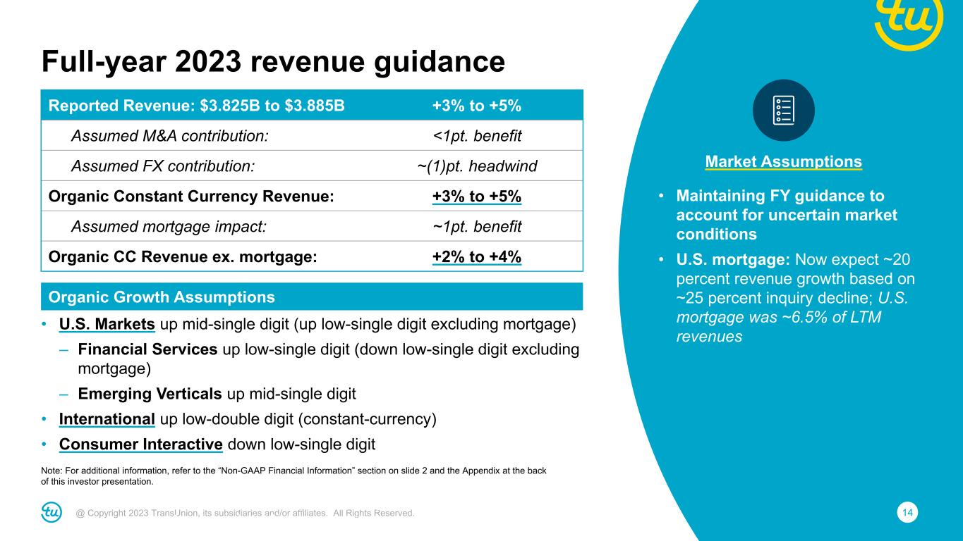 13@ Copyright 2023 TransUnion, its subsidiaries and/or affiliates. All Rights Reserved. Reported Revenue: $973M to $988M +4% to +5% Assumed M&A contribution: No impact Assumed FX contribution: Insignificant Organic Constant Currency Revenue: +4% to +5% Assumed mortgage impact: ~1.5pt. benefit Organic CC Revenue ex. mortgage: +2.5% to +3.5% Adjusted EBITDA: $361M to $370M +6% to +9% Assumed FX contribution: Insignificant Adjusted EBITDA margin: 37.1% to 37.4% Adjusted EBITDA margin bps change: +80bps to +110bps Adjusted Diluted EPS: $0.92 to $0.95 (1%) to +2% Note: For additional information, refer to the “Non-GAAP Financial Information” section on slide 2 and the Appendix at the back of this investor presentation. Revenue Third quarter 2023 guidance Strong results in International and improving growth in U.S. Markets Adjusted EBITDA Sequential margin improvement driven by higher revenues, Neustar synergies and proactive cost actions Note: For additional information, refer to the “Non-GAAP Financial Information” section on slide 2 and the Appendix at the back of this investor presentation.