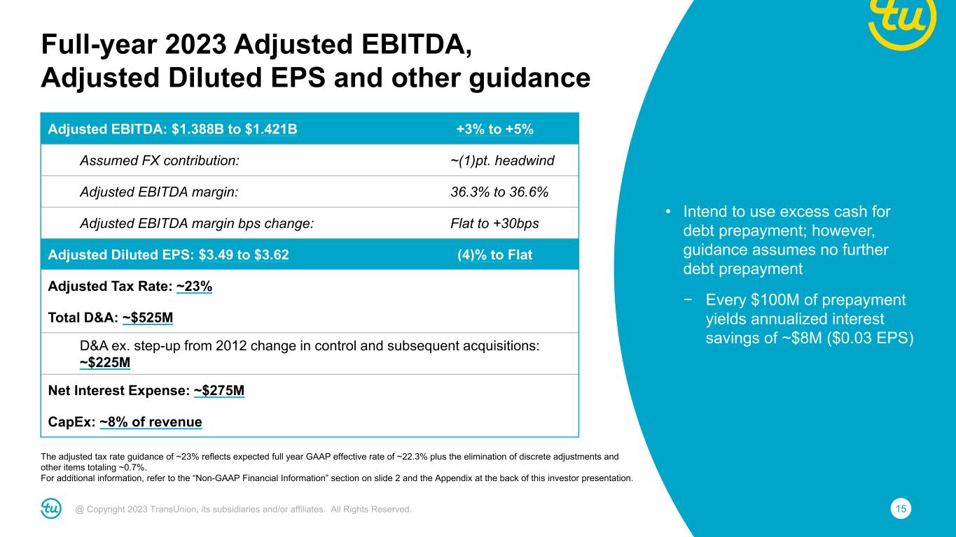 14@ Copyright 2023 TransUnion, its subsidiaries and/or affiliates. All Rights Reserved. Organic Growth Assumptions • Maintaining FY guidance to account for uncertain market conditions • U.S. mortgage: Now expect ~20 percent revenue growth based on ~25 percent inquiry decline; U.S. mortgage was ~6.5% of LTM revenues Note: For additional information, refer to the “Non-GAAP Financial Information” section on slide 2 and the Appendix at the back of this investor presentation. Full-year 2023 revenue guidance Reported Revenue: $3.825B to $3.885B +3% to +5% Assumed M&A contribution: <1pt. benefit Assumed FX contribution: ~(1)pt. headwind Organic Constant Currency Revenue: +3% to +5% Assumed mortgage impact: ~1pt. benefit Organic CC Revenue ex. mortgage: +2% to +4% Market Assumptions • U.S. Markets up mid-single digit (up low-single digit excluding mortgage) – Financial Services up low-single digit (down low-single digit excluding mortgage) – Emerging Verticals up mid-single digit • International up low-double digit (constant-currency) • Consumer Interactive down low-single digit Note: For additional information, refer to the “Non-GAAP Financial Information” section on slide 2 and the Appendix at the back of this investor presentation.