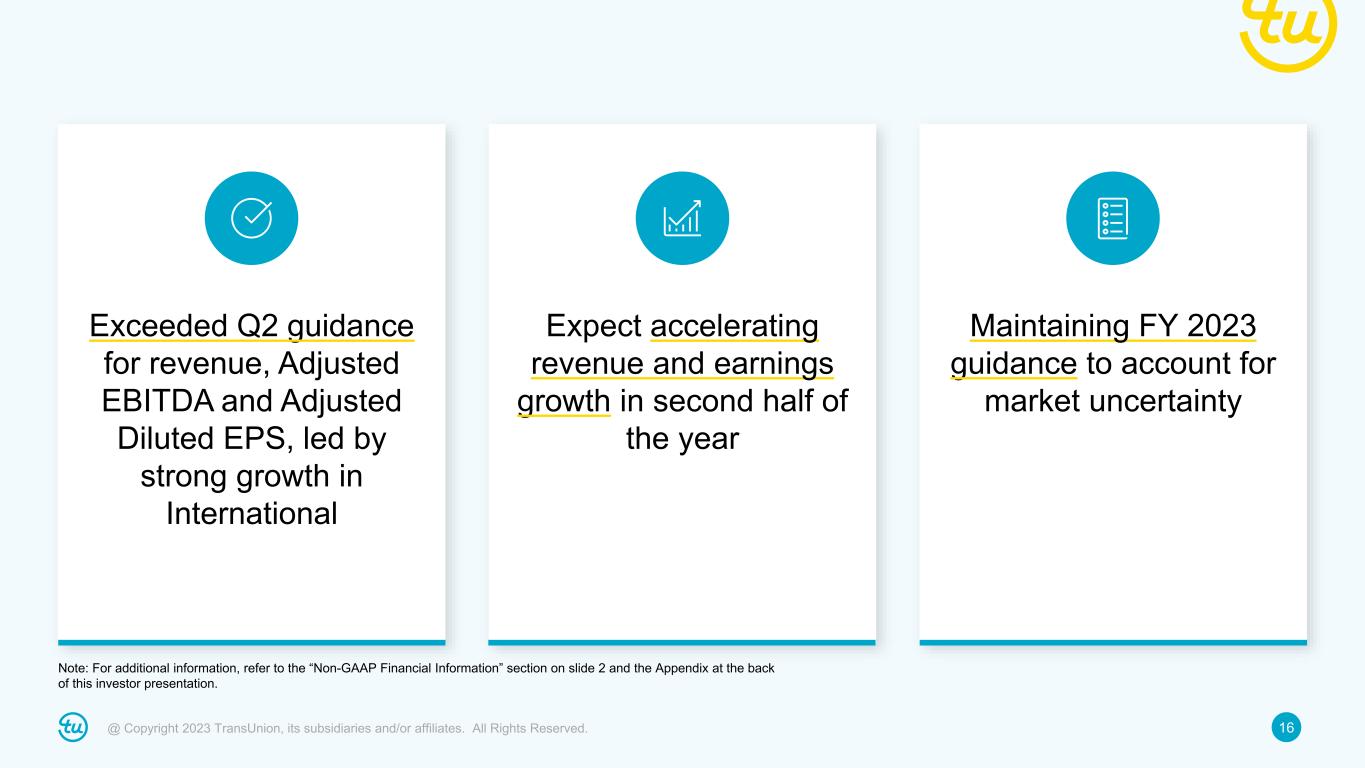 15@ Copyright 2023 TransUnion, its subsidiaries and/or affiliates. All Rights Reserved. • Intend to use excess cash for debt prepayment; however, guidance assumes no further debt prepayment − Every $100M of prepayment yields annualized interest savings of ~$8M ($0.03 EPS) The adjusted tax rate guidance of ~23% reflects expected full year GAAP effective rate of ~22.3% plus the elimination of discrete adjustments and other items totaling ~0.7%. For additional information, refer to the “Non-GAAP Financial Information” section on slide 2 and the Appendix at the back of this investor presentation. Full-year 2023 Adjusted EBITDA, Adjusted Diluted EPS and other guidance Adjusted EBITDA: $1.388B to $1.421B +3% to +5% Assumed FX contribution: ~(1)pt. headwind Adjusted EBITDA margin: 36.3% to 36.6% Adjusted EBITDA margin bps change: Flat to +30bps Adjusted Diluted EPS: $3.49 to $3.62 (4)% to Flat Adjusted Tax Rate: ~23% Total D&A: ~$525M D&A ex. step-up from 2012 change in control and subsequent acquisitions: ~$225M Net Interest Expense: ~$275M CapEx: ~8% of revenue