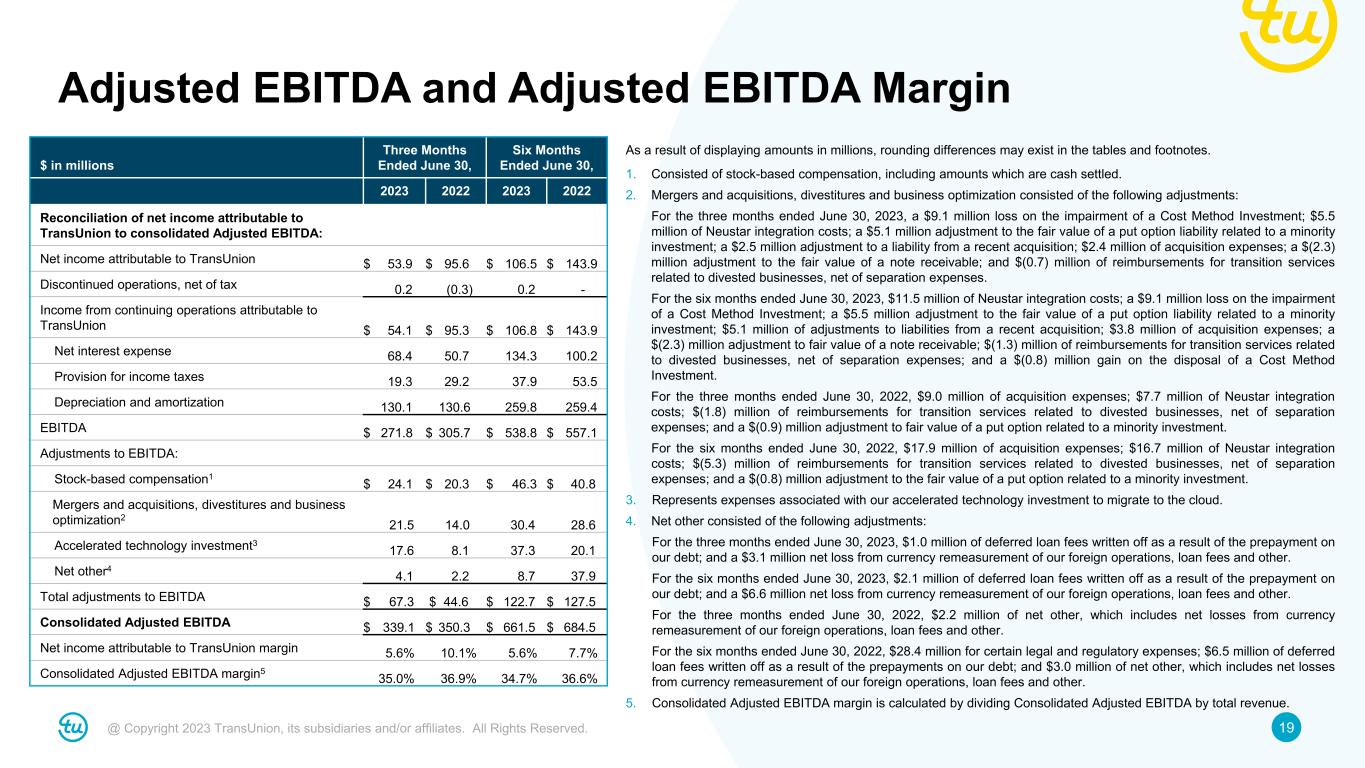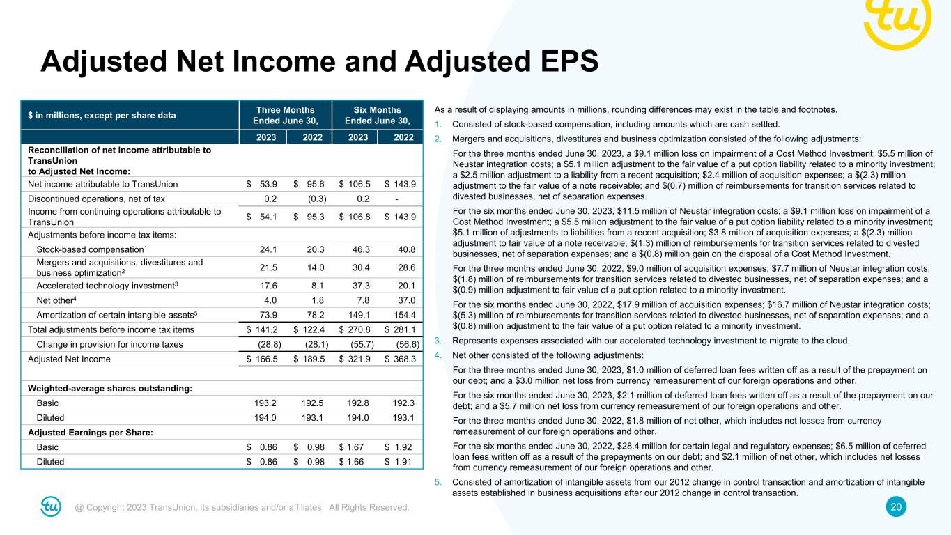 19@ Copyright 2023 TransUnion, its subsidiaries and/or affiliates. All Rights Reserved. Adjusted EBITDA and Adjusted EBITDA Margin $ in millions Three Months Ended June 30, Six Months Ended June 30, 2023 2022 2023 2022 Reconciliation of net income attributable to TransUnion to consolidated Adjusted EBITDA: Net income attributable to TransUnion $ 53.9 $ 95.6 $ 106.5 $ 143.9 Discontinued operations, net of tax 0.2 (0.3) 0.2 - Income from continuing operations attributable to TransUnion $ 54.1 $ 95.3 $ 106.8 $ 143.9 Net interest expense 68.4 50.7 134.3 100.2 Provision for income taxes 19.3 29.2 37.9 53.5 Depreciation and amortization 130.1 130.6 259.8 259.4 EBITDA $ 271.8 $ 305.7 $ 538.8 $ 557.1 Adjustments to EBITDA: Stock-based compensation1 $ 24.1 $ 20.3 $ 46.3 $ 40.8 Mergers and acquisitions, divestitures and business optimization2 21.5 14.0 30.4 28.6 Accelerated technology investment3 17.6 8.1 37.3 20.1 Net other4 4.1 2.2 8.7 37.9 Total adjustments to EBITDA $ 67.3 $ 44.6 $ 122.7 $ 127.5 Consolidated Adjusted EBITDA $ 339.1 $ 350.3 $ 661.5 $ 684.5 Net income attributable to TransUnion margin 5.6% 10.1% 5.6% 7.7% Consolidated Adjusted EBITDA margin5 35.0% 36.9% 34.7% 36.6% As a result of displaying amounts in millions, rounding differences may exist in the tables and footnotes. 1. Consisted of stock-based compensation, including amounts which are cash settled. 2. Mergers and acquisitions, divestitures and business optimization consisted of the following adjustments: For the three months ended June 30, 2023, a $9.1 million loss on the impairment of a Cost Method Investment; $5.5 million of Neustar integration costs; a $5.1 million adjustment to the fair value of a put option liability related to a minority investment; a $2.5 million adjustment to a liability from a recent acquisition; $2.4 million of acquisition expenses; a $(2.3) million adjustment to the fair value of a note receivable; and $(0.7) million of reimbursements for transition services related to divested businesses, net of separation expenses. For the six months ended June 30, 2023, $11.5 million of Neustar integration costs; a $9.1 million loss on the impairment of a Cost Method Investment; a $5.5 million adjustment to the fair value of a put option liability related to a minority investment; $5.1 million of adjustments to liabilities from a recent acquisition; $3.8 million of acquisition expenses; a $(2.3) million adjustment to fair value of a note receivable; $(1.3) million of reimbursements for transition services related to divested businesses, net of separation expenses; and a $(0.8) million gain on the disposal of a Cost Method Investment. For the three months ended June 30, 2022, $9.0 million of acquisition expenses; $7.7 million of Neustar integration costs; $(1.8) million of reimbursements for transition services related to divested businesses, net of separation expenses; and a $(0.9) million adjustment to fair value of a put option related to a minority investment. For the six months ended June 30, 2022, $17.9 million of acquisition expenses; $16.7 million of Neustar integration costs; $(5.3) million of reimbursements for transition services related to divested businesses, net of separation expenses; and a $(0.8) million adjustment to the fair value of a put option related to a minority investment. 3. Represents expenses associated with our accelerated technology investment to migrate to the cloud. 4. Net other consisted of the following adjustments: For the three months ended June 30, 2023, $1.0 million of deferred loan fees written off as a result of the prepayment on our debt; and a $3.1 million net loss from currency remeasurement of our foreign operations, loan fees and other. For the six months ended June 30, 2023, $2.1 million of deferred loan fees written off as a result of the prepayment on our debt; and a $6.6 million net loss from currency remeasurement of our foreign operations, loan fees and other. For the three months ended June 30, 2022, $2.2 million of net other, which includes net losses from currency remeasurement of our foreign operations, loan fees and other. For the six months ended June 30, 2022, $28.4 million for certain legal and regulatory expenses; $6.5 million of deferred loan fees written off as a result of the prepayments on our debt; and $3.0 million of net other, which includes net losses from currency remeasurement of our foreign operations, loan fees and other. 5. Consolidated Adjusted EBITDA margin is calculated by dividing Consolidated Adjusted EBITDA by total revenue.