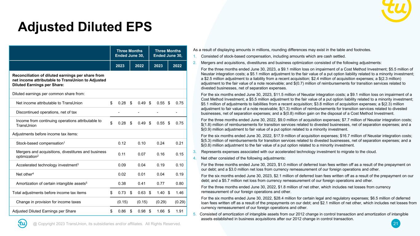 20@ Copyright 2023 TransUnion, its subsidiaries and/or affiliates. All Rights Reserved. Adjusted Net Income and Adjusted EPS $ in millions, except per share data Three Months Ended June 30, Six Months Ended June 30, 2023 2022 2023 2022 Reconciliation of net income attributable to TransUnion to Adjusted Net Income: Net income attributable to TransUnion $ 53.9 $ 95.6 $ 106.5 $ 143.9 Discontinued operations, net of tax 0.2 (0.3) 0.2 - Income from continuing operations attributable to TransUnion $ 54.1 $ 95.3 $ 106.8 $ 143.9 Adjustments before income tax items: Stock-based compensation1 24.1 20.3 46.3 40.8 Mergers and acquisitions, divestitures and business optimization2 21.5 14.0 30.4 28.6 Accelerated technology investment3 17.6 8.1 37.3 20.1 Net other4 4.0 1.8 7.8 37.0 Amortization of certain intangible assets5 73.9 78.2 149.1 154.4 Total adjustments before income tax items $ 141.2 $ 122.4 $ 270.8 $ 281.1 Change in provision for income taxes (28.8) (28.1) (55.7) (56.6) Adjusted Net Income $ 166.5 $ 189.5 $ 321.9 $ 368.3 Weighted-average shares outstanding: Basic 193.2 192.5 192.8 192.3 Diluted 194.0 193.1 194.0 193.1 Adjusted Earnings per Share: Basic $ 0.86 $ 0.98 $ 1.67 $ 1.92 Diluted $ 0.86 $ 0.98 $ 1.66 $ 1.91 As a result of displaying amounts in millions, rounding differences may exist in the table and footnotes. 1. Consisted of stock-based compensation, including amounts which are cash settled. 2. Mergers and acquisitions, divestitures and business optimization consisted of the following adjustments: For the three months ended June 30, 2023, a $9.1 million loss on impairment of a Cost Method Investment; $5.5 million of Neustar integration costs; a $5.1 million adjustment to the fair value of a put option liability related to a minority investment; a $2.5 million adjustment to a liability from a recent acquisition; $2.4 million of acquisition expenses; a $(2.3) million adjustment to the fair value of a note receivable; and $(0.7) million of reimbursements for transition services related to divested businesses, net of separation expenses. For the six months ended June 30, 2023, $11.5 million of Neustar integration costs; a $9.1 million loss on impairment of a Cost Method Investment; a $5.5 million adjustment to the fair value of a put option liability related to a minority investment; $5.1 million of adjustments to liabilities from a recent acquisition; $3.8 million of acquisition expenses; a $(2.3) million adjustment to fair value of a note receivable; $(1.3) million of reimbursements for transition services related to divested businesses, net of separation expenses; and a $(0.8) million gain on the disposal of a Cost Method Investment. For the three months ended June 30, 2022, $9.0 million of acquisition expenses; $7.7 million of Neustar integration costs; $(1.8) million of reimbursements for transition services related to divested businesses, net of separation expenses; and a $(0.9) million adjustment to fair value of a put option related to a minority investment. For the six months ended June 30, 2022, $17.9 million of acquisition expenses; $16.7 million of Neustar integration costs; $(5.3) million of reimbursements for transition services related to divested businesses, net of separation expenses; and a $(0.8) million adjustment to the fair value of a put option related to a minority investment. 3. Represents expenses associated with our accelerated technology investment to migrate to the cloud. 4. Net other consisted of the following adjustments: For the three months ended June 30, 2023, $1.0 million of deferred loan fees written off as a result of the prepayment on our debt; and a $3.0 million net loss from currency remeasurement of our foreign operations and other. For the six months ended June 30, 2023, $2.1 million of deferred loan fees written off as a result of the prepayment on our debt; and a $5.7 million net loss from currency remeasurement of our foreign operations and other. For the three months ended June 30, 2022, $1.8 million of net other, which includes net losses from currency remeasurement of our foreign operations and other. For the six months ended June 30, 2022, $28.4 million for certain legal and regulatory expenses; $6.5 million of deferred loan fees written off as a result of the prepayments on our debt; and $2.1 million of net other, which includes net losses from currency remeasurement of our foreign operations and other. 5. Consisted of amortization of intangible assets from our 2012 change in control transaction and amortization of intangible assets established in business acquisitions after our 2012 change in control transaction.