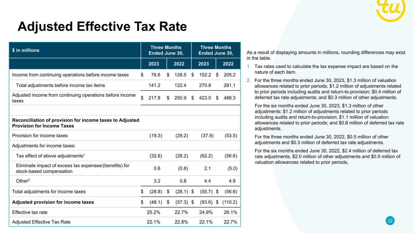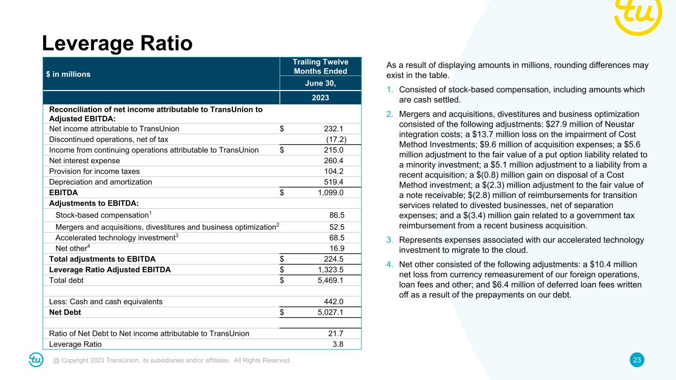 22@ Copyright 2023 TransUnion, its subsidiaries and/or affiliates. All Rights Reserved. Adjusted Effective Tax Rate $ in millions Three Months Ended June 30, Three Months Ended June 30, 2023 2022 2023 2022 Income from continuing operations before income taxes $ 76.6 $ 128.5 $ 152.2 $ 205.2 Total adjustments before income tax items 141.2 122.4 270.8 281.1 Adjusted income from continuing operations before income taxes $ 217.8 $ 250.9 $ 423.0 $ 486.3 Reconciliation of provision for income taxes to Adjusted Provision for Income Taxes Provision for income taxes (19.3) (29.2) (37.9) (53.5) Adjustments for income taxes: Tax effect of above adjustments1 (32.6) (28.2) (62.2) (56.6) Eliminate impact of excess tax expenses/(benefits) for stock-based compensation 0.6 (0.8) 2.1 (5.0) Other2 3.2 0.8 4.4 4.9 Total adjustments for income taxes $ (28.8) $ (28.1) $ (55.7) $ (56.6) Adjusted provision for income taxes $ (48.1) $ (57.3) $ (93.6) $ (110.2) Effective tax rate 25.2% 22.7% 24.9% 26.1% Adjusted Effective Tax Rate 22.1% 22.8% 22.1% 22.7% As a result of displaying amounts in millions, rounding differences may exist in the table. 1. Tax rates used to calculate the tax expense impact are based on the nature of each item. 2. For the three months ended June 30, 2023, $1.3 million of valuation allowances related to prior periods; $1.2 million of adjustments related to prior periods including audits and return-to-provision; $0.4 million of deferred tax rate adjustments; and $0.3 million of other adjustments. For the six months ended June 30, 2023, $1.3 million of other adjustments; $1.2 million of adjustments related to prior periods including audits and return-to-provision; $1.1 million of valuation allowances related to prior periods; and $0.8 million of deferred tax rate adjustments. For the three months ended June 30, 2022, $0.5 million of other adjustments and $0.3 million of deferred tax rate adjustments. For the six months ended June 30, 2022, $2.4 million of deferred tax rate adjustments, $2.0 million of other adjustments and $0.5 million of valuation allowances related to prior periods.