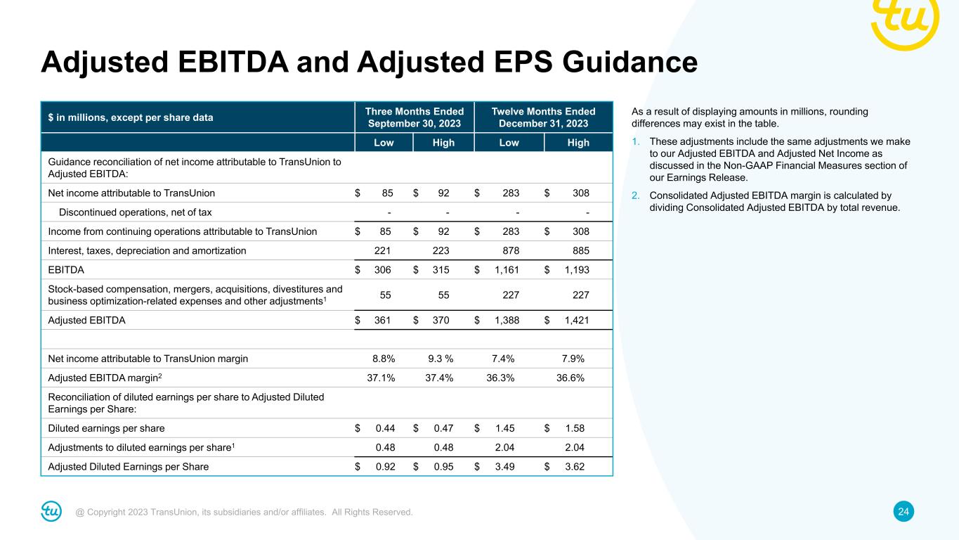 24@ Copyright 2023 TransUnion, its subsidiaries and/or affiliates. All Rights Reserved. Adjusted EBITDA and Adjusted EPS Guidance $ in millions, except per share data Three Months Ended September 30, 2023 Twelve Months Ended December 31, 2023 Low High Low High Guidance reconciliation of net income attributable to TransUnion to Adjusted EBITDA: Net income attributable to TransUnion $ 85 $ 92 $ 283 $ 308 Discontinued operations, net of tax - - - - Income from continuing operations attributable to TransUnion $ 85 $ 92 $ 283 $ 308 Interest, taxes, depreciation and amortization 221 223 878 885 EBITDA $ 306 $ 315 $ 1,161 $ 1,193 Stock-based compensation, mergers, acquisitions, divestitures and business optimization-related expenses and other adjustments1 55 55 227 227 Adjusted EBITDA $ 361 $ 370 $ 1,388 $ 1,421 Net income attributable to TransUnion margin 8.8% 9.3 % 7.4% 7.9% Adjusted EBITDA margin2 37.1% 37.4% 36.3% 36.6% Reconciliation of diluted earnings per share to Adjusted Diluted Earnings per Share: Diluted earnings per share $ 0.44 $ 0.47 $ 1.45 $ 1.58 Adjustments to diluted earnings per share1 0.48 0.48 2.04 2.04 Adjusted Diluted Earnings per Share $ 0.92 $ 0.95 $ 3.49 $ 3.62 As a result of displaying amounts in millions, rounding differences may exist in the table. 1. These adjustments include the same adjustments we make to our Adjusted EBITDA and Adjusted Net Income as discussed in the Non-GAAP Financial Measures section of our Earnings Release. 2. Consolidated Adjusted EBITDA margin is calculated by dividing Consolidated Adjusted EBITDA by total revenue.
