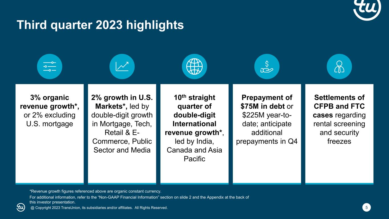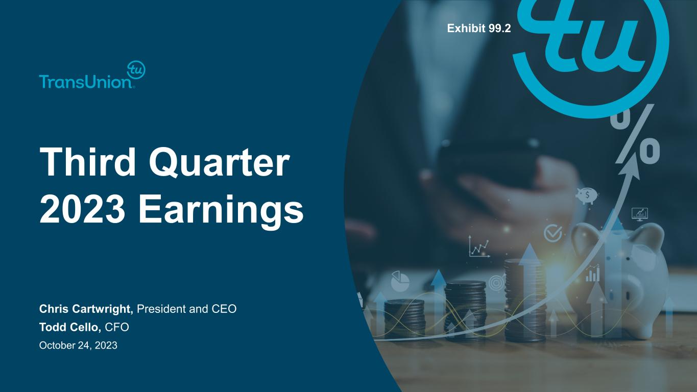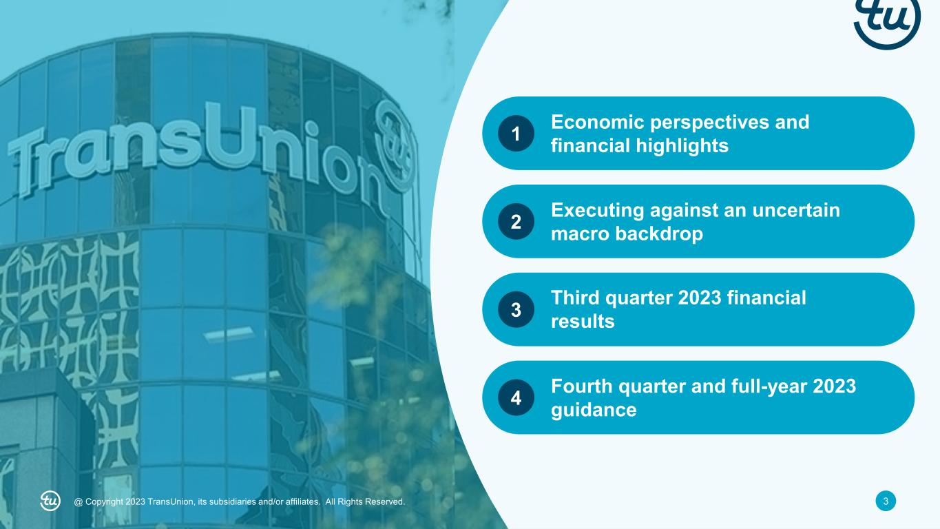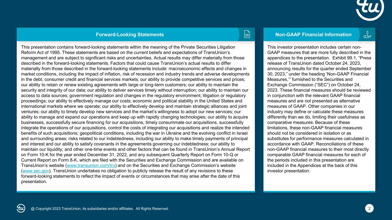 2@ Copyright 2023 TransUnion, its subsidiaries and/or affiliates. All Rights Reserved. Non-GAAP Financial InformationForward-Looking Statements This presentation contains forward-looking statements within the meaning of the Private Securities Litigation Reform Act of 1995. These statements are based on the current beliefs and expectations of TransUnion’s management and are subject to significant risks and uncertainties. Actual results may differ materially from those described in the forward-looking statements. Factors that could cause TransUnion’s actual results to differ materially from those described in the forward-looking statements include: macroeconomic effects and changes in market conditions, including the impact of inflation, risk of recession and industry trends and adverse developments in the debt, consumer credit and financial services markets; our ability to provide competitive services and prices; our ability to retain or renew existing agreements with large or long-term customers; our ability to maintain the security and integrity of our data; our ability to deliver services timely without interruption; our ability to maintain our access to data sources; government regulation and changes in the regulatory environment; litigation or regulatory proceedings; our ability to effectively manage our costs; economic and political stability in the United States and international markets where we operate; our ability to effectively develop and maintain strategic alliances and joint ventures; our ability to timely develop new services and the market’s willingness to adopt our new services; our ability to manage and expand our operations and keep up with rapidly changing technologies; our ability to acquire businesses, successfully secure financing for our acquisitions, timely consummate our acquisitions, successfully integrate the operations of our acquisitions, control the costs of integrating our acquisitions and realize the intended benefits of such acquisitions; geopolitical conditions, including the war in Ukraine and the evolving conflict in Israel and surrounding areas; risks related to our indebtedness, including our ability to make timely payments of principal and interest and our ability to satisfy covenants in the agreements governing our indebtedness; our ability to maintain our liquidity; and other one-time events and other factors that can be found in TransUnion’s Annual Report on Form 10-K for the year ended December 31, 2022, and any subsequent Quarterly Report on Form 10-Q or Current Report on Form 8-K, which are filed with the Securities and Exchange Commission and are available on TransUnion’s website (www.transunion.com/tru) and on the Securities and Exchange Commission’s website (www.sec.gov). TransUnion undertakes no obligation to publicly release the result of any revisions to these forward-looking statements to reflect the impact of events or circumstances that may arise after the date of this presentation. This investor presentation includes certain non- GAAP measures that are more fully described in the appendices to the presentation. Exhibit 99.1, “Press release of TransUnion dated October 24, 2023, announcing results for the quarter ended September 30, 2023,” under the heading ‘Non-GAAP Financial Measures,’” furnished to the Securities and Exchange Commission (“SEC”) on October 24, 2023. These financial measures should be reviewed in conjunction with the relevant GAAP financial measures and are not presented as alternative measures of GAAP. Other companies in our industry may define or calculate these measures differently than we do, limiting their usefulness as comparative measures. Because of these limitations, these non-GAAP financial measures should not be considered in isolation or as substitutes for performance measures calculated in accordance with GAAP. Reconciliations of these non-GAAP financial measures to their most directly comparable GAAP financial measures for each of the periods included in this presentation are included in the Appendices at the back of this investor presentation.