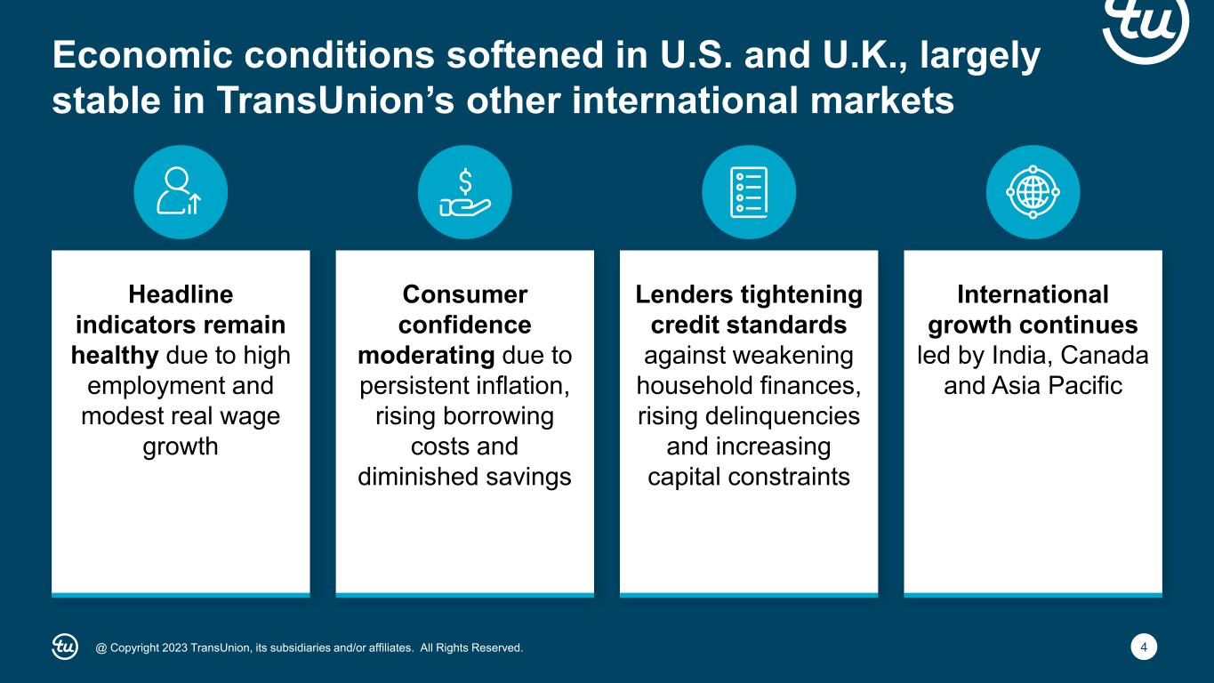 3@ Copyright 2023 TransUnion, its subsidiaries and/or affiliates. All Rights Reserved. Economic perspectives and financial highlights Executing against an uncertain macro backdrop Third quarter 2023 financial results 1 2 3 Fourth quarter and full-year 2023 guidance4