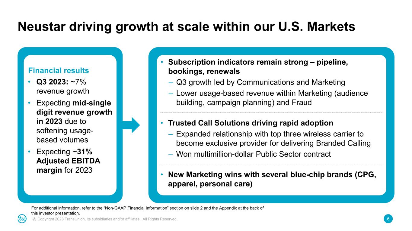 5@ Copyright 2023 TransUnion, its subsidiaries and/or affiliates. All Rights Reserved. *Revenue growth figures referenced above are organic constant currency. Third quarter 2023 highlights 3% organic revenue growth*, or 2% excluding U.S. mortgage 2% growth in U.S. Markets*, led by double-digit growth in Mortgage, Tech, Retail & E- Commerce, Public Sector and Media 10th straight quarter of double-digit International revenue growth*, led by India, Canada and Asia Pacific Prepayment of $75M in debt or $225M year-to- date; anticipate additional prepayments in Q4 Settlements of CFPB and FTC cases regarding rental screening and security freezes For additional information, refer to the “Non-GAAP Financial Information” section on slide 2 and the Appendix at the back of this investor presentation.
